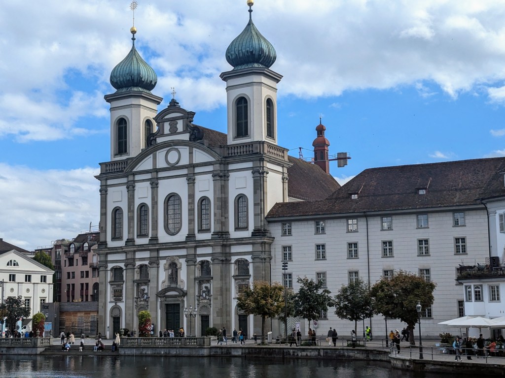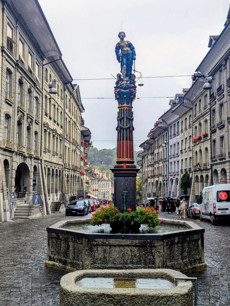 The most amusing statue is on a balcony on the front of the church. The two are labeled as New Justice and Old Justice.