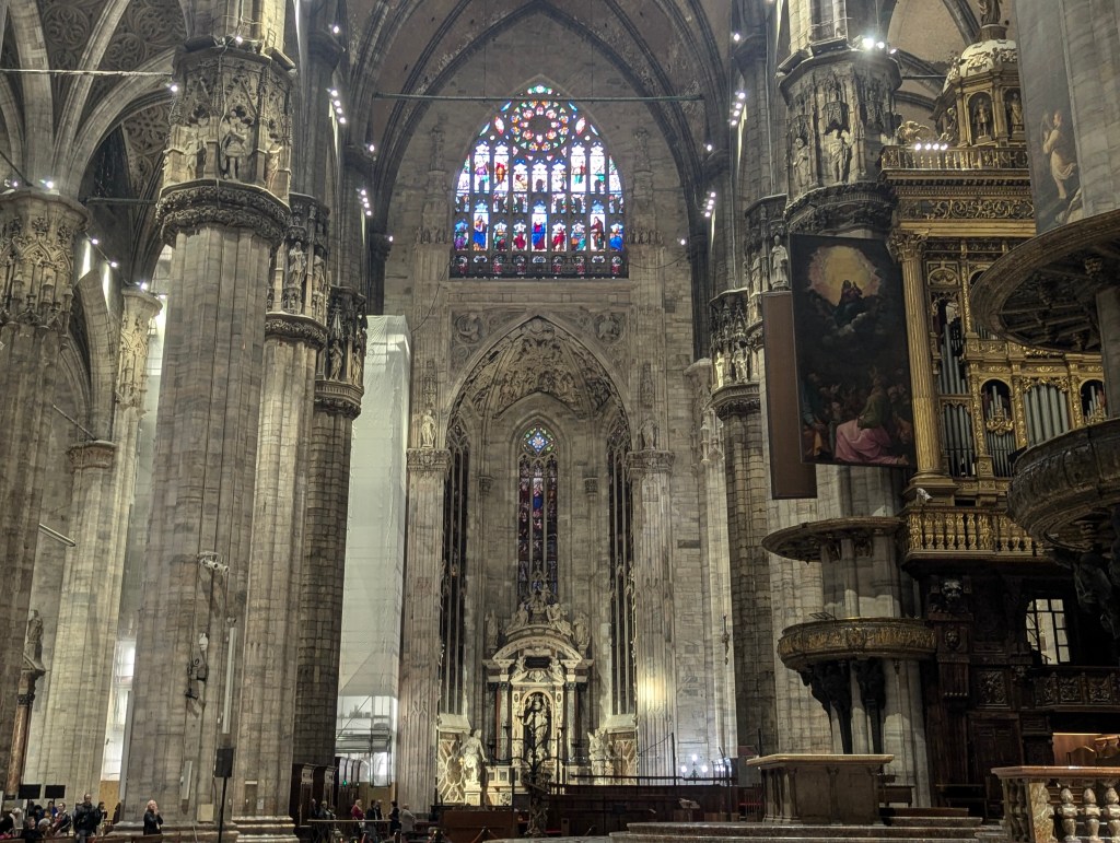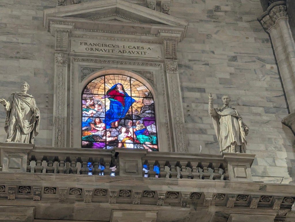 Finally we headed back toward the Duomo, a legacy of the Visconti family. It was paid for by the Duke as a way of “buying” his title of Duke for independence for Milan from the Holy Roman Empire. It was started in 1386 in the Gothic style, which was already out of vogue in Europe. It is the only Gothic style church in Italy. The main spire was finished in 1774; the front was finished in 1814; the last gates were completed in 1965. It is the largest Gothic church in the world. Part of the reason it took so long to complete was the sacking of Milan by the French in 1499 after which the funding dried up except for private donations.