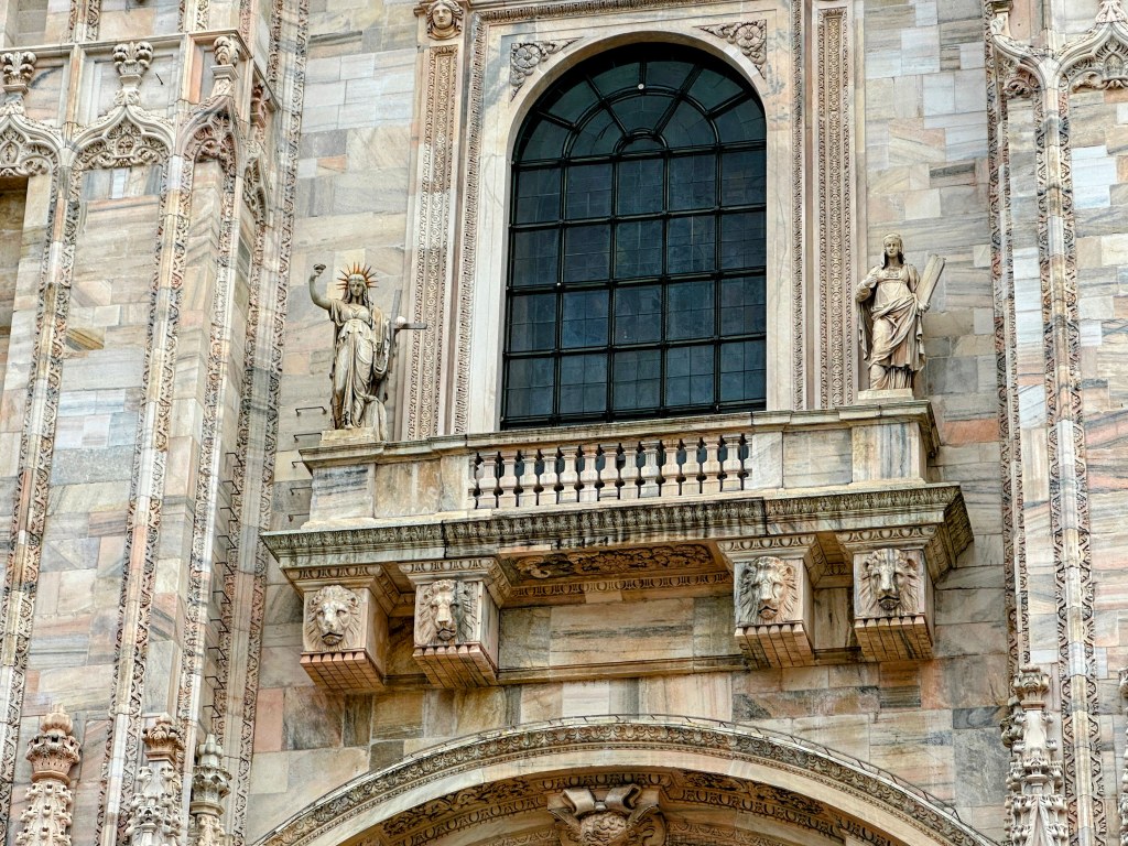 Although we met in front of the Duomo, Marco led us away to some of Italy’s history before returning to this important structure. First he showed us the snake-eating-man symbol, also known as a Biscione, which was the symbol for the influential Visconti family (1277-1477). (It is also a reference to Dante). He told us their reign is known as the second golden age of Milan. The first was in the 4th century. The Visconti family symbol is now the symbol for Milan and also has been adopted by several companies including a local TV channel, a soccer team, and Alpha Romeo cars.