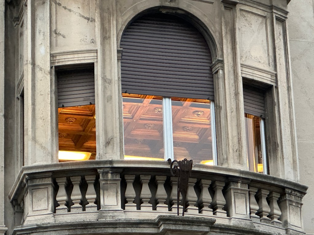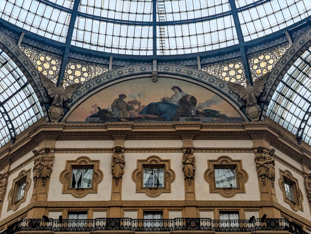It had been so crowded with people during our tour that Marco walked through briskly making picture taking difficult. Due to the presence of elegant shops and clubs it has been a meeting place for the Milanese bourgeoisie since its inauguration. It has been nicknamed “drawing room of Milan.” It is among the most famous examples of European iron architecture, as seen in the balustrades below, and represents the archetype of the nineteenth-century shopping gallery and is often considered one of the first examples of a shopping center in the world.