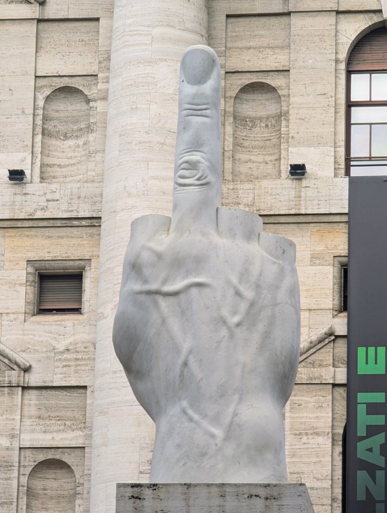 The last place Marco took us was to see L.O.V.E., commonly known as il Dito (Italian for “the finger”), a sculpture by Italian artist Maurizzio Cattalan (1960- ). The name L.O.V.E. is the acronym of “Libertà, Odio, Vendetta, Eternità” (“Freedom, Hatred, Revenge, Eternity”).