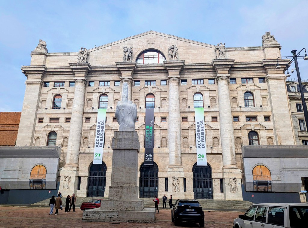 The sculpture is located in Piazza degli Affari, where the Italian stock exchange is located. Maurizio Cattelan has never disclosed the exact meaning of the sculpture. The two most accepted explanations are 1: that it represents both a critique of the Fascist salute and 2: that it is designed as a protest against financial institutions after the 2008 financial crisis. The stock exchange building was built during fascism by architect Paolo Mezzanotte and completed in 1932. But as Marco pointed out, if the first option is true, why is the finger pointed away from the stock exchange toward the viewer?