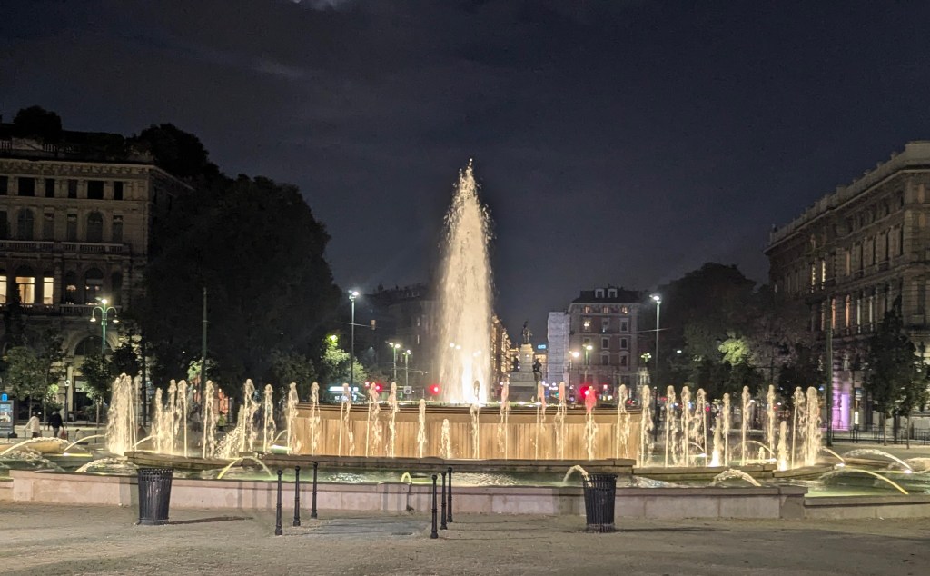 In another direction we could see Porta Sempione (“Simplon Gate”), the city gate. The name is used both to refer to the gate proper and to the surrounding district The gate is marked by a landmark triumphal arch called Arco della Pace (“Arch of Peace”), dating back to the 19th century. We headed over.