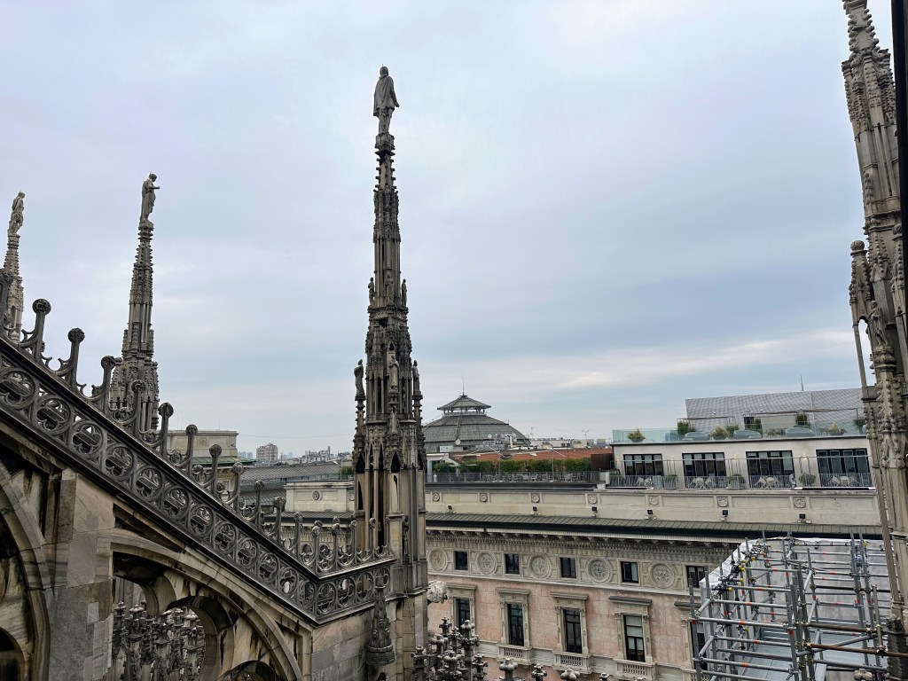 And now it was time for the Duomo. We had bought the “Fast Track” tickets online which meant we were to ride the elevators up to the terraces first (rather than climb the nearly 300 stairs). We were let out first on the lower terrace, which was good because I needed to get used to the height. The terraces measure over 86,000 square feet over the two levels.