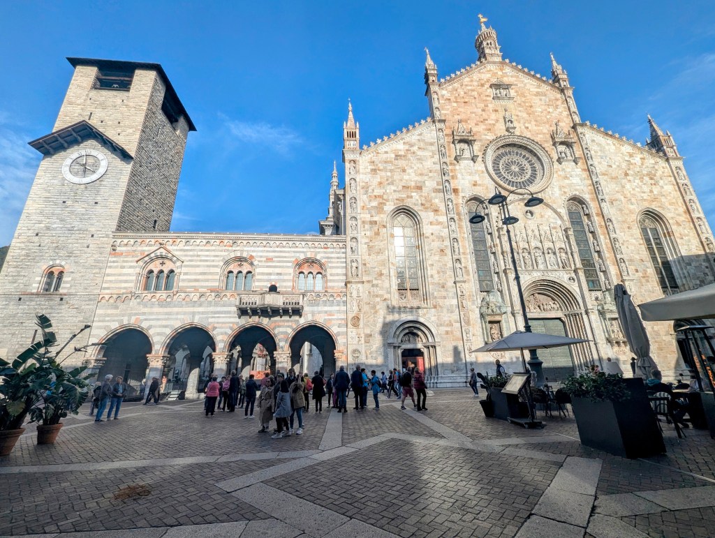We drove north to Como where we had a room rented in an apartment building right by the water. We walked by the lake, but the weather was a bit cold and damp, so we headed toward the old part of the town. Our first stop was the Duomo di Como, reputably last Gothic cathedral built in Italy. Construction began in 1396, and although considered Gothic, it has Romanesque, Renaissance, and Baroque architectural style elements.