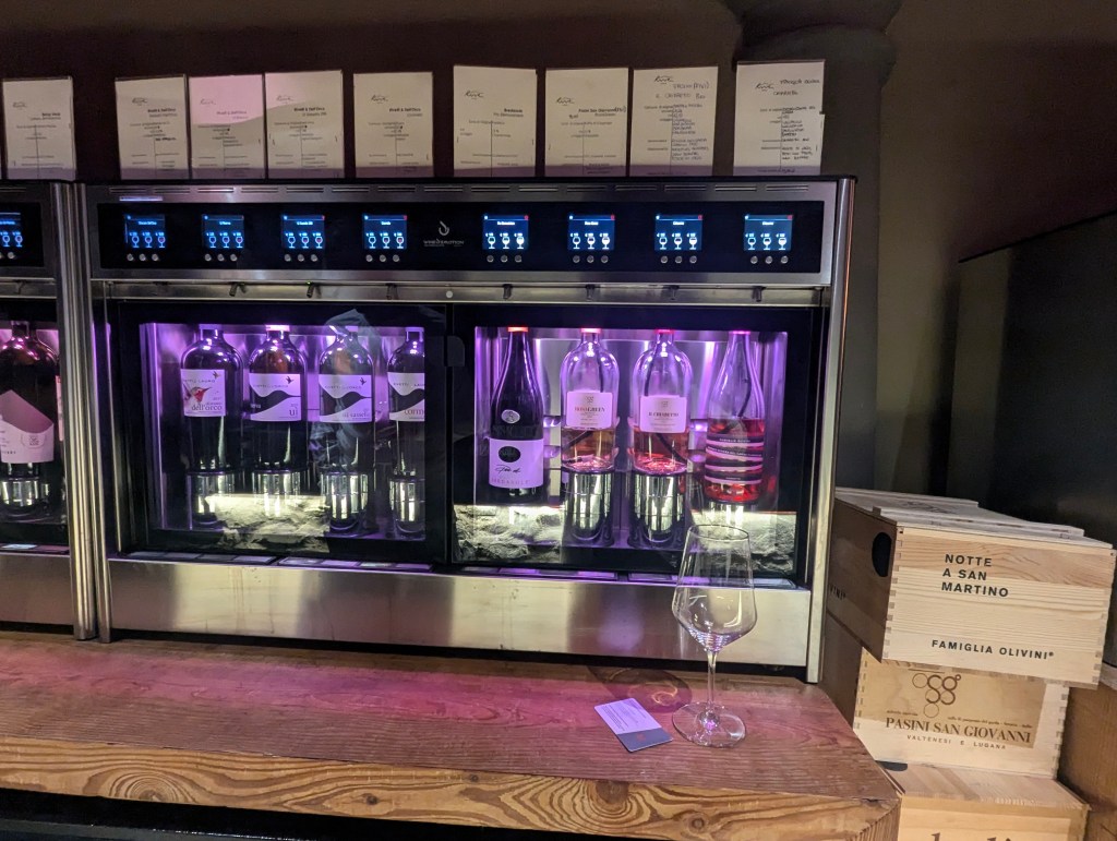 We enjoyed another Milanese saffron risotto, this time with chunks of ossobuco. Rive Enotica also had a self-serve wine bar, a new experience for me. Between us we were able to taste 7 different wines with our 3 courses, heaven.