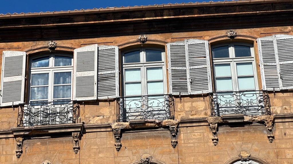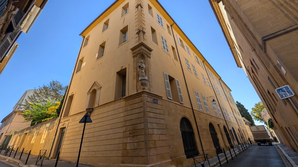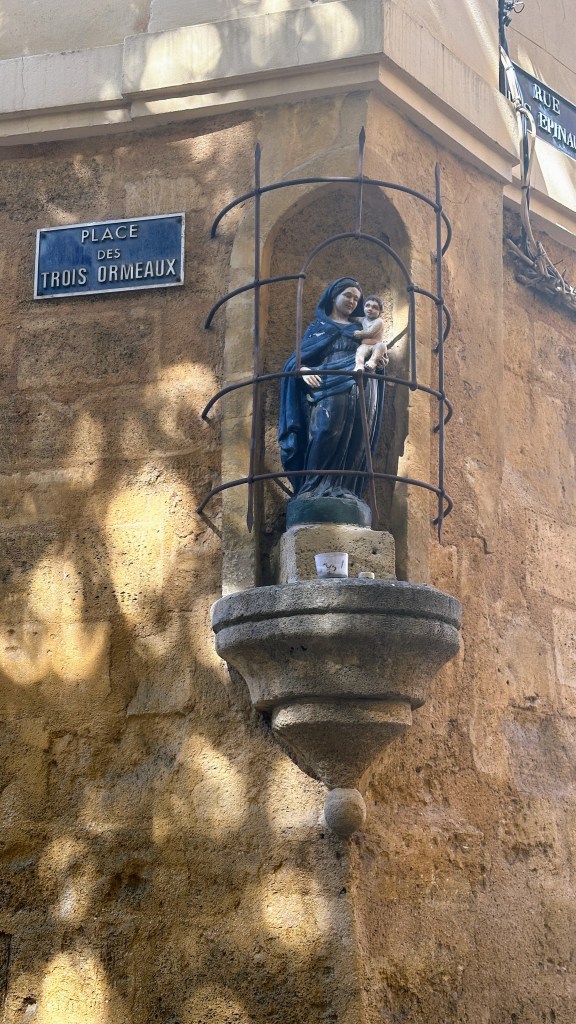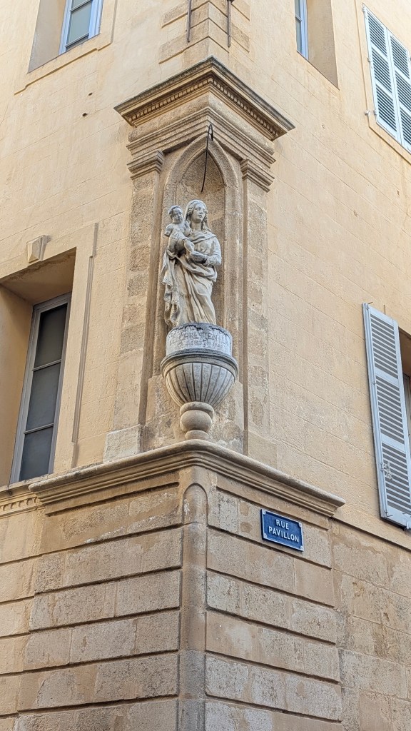 A religious niche featuring a statue of the Virgin Mary holding the Baby Jesus is located on the home’s corner. These shrines, known as oratories or niches, are commonly found on the corners of buildings throughout Aix-en-Provence.  Historically, they served as comforting icons and protectors for the city, particularly during times of plague or for pilgrims.