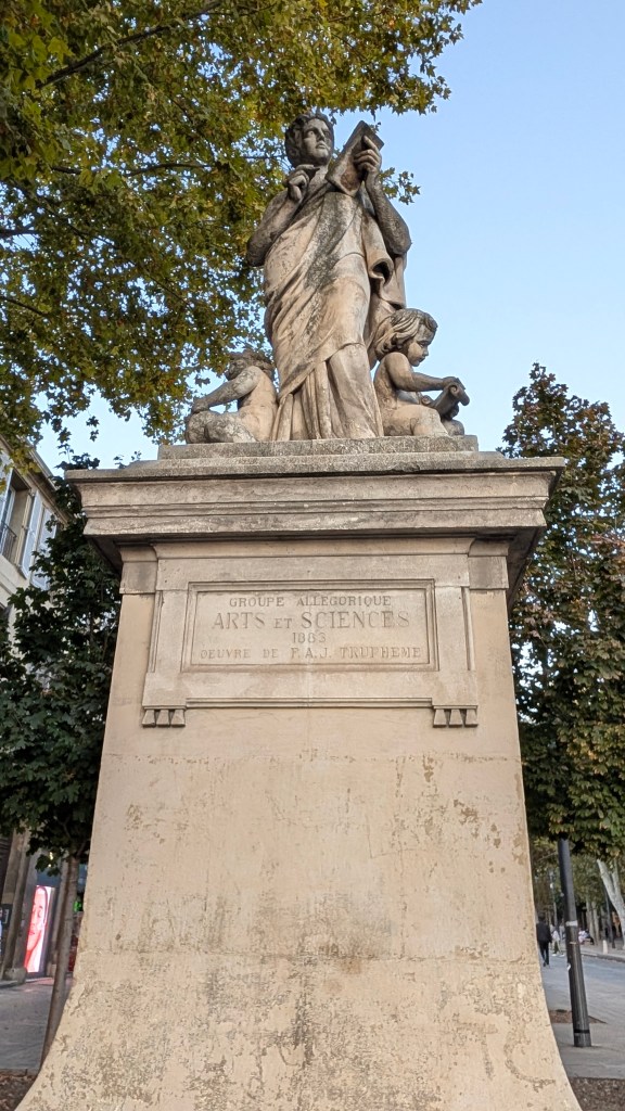 At the entrance to Cours Mirabeau stands a statue entitled “Arts and Sciences”, a work of sculptor François Truphème, created in 1883.  The allegorical sculpture group depicts figures representing tension or cooperation between artistic and scientific pursuits.