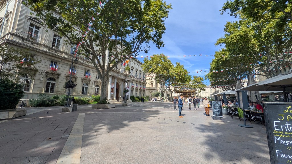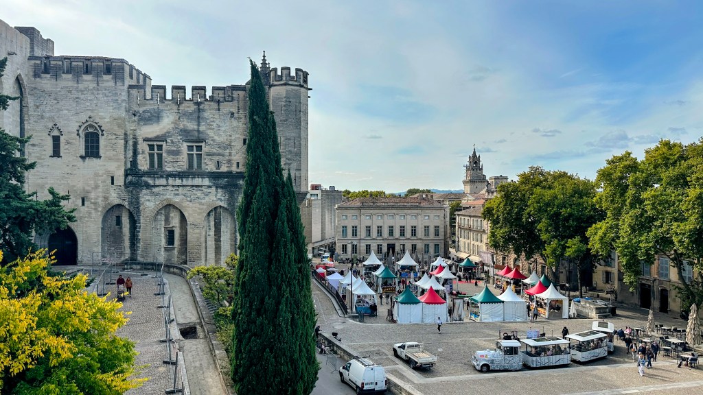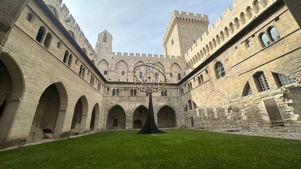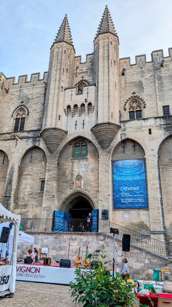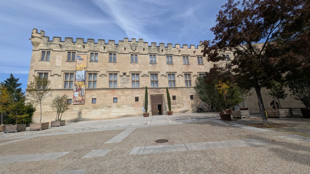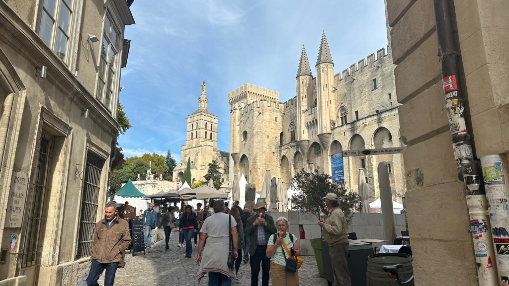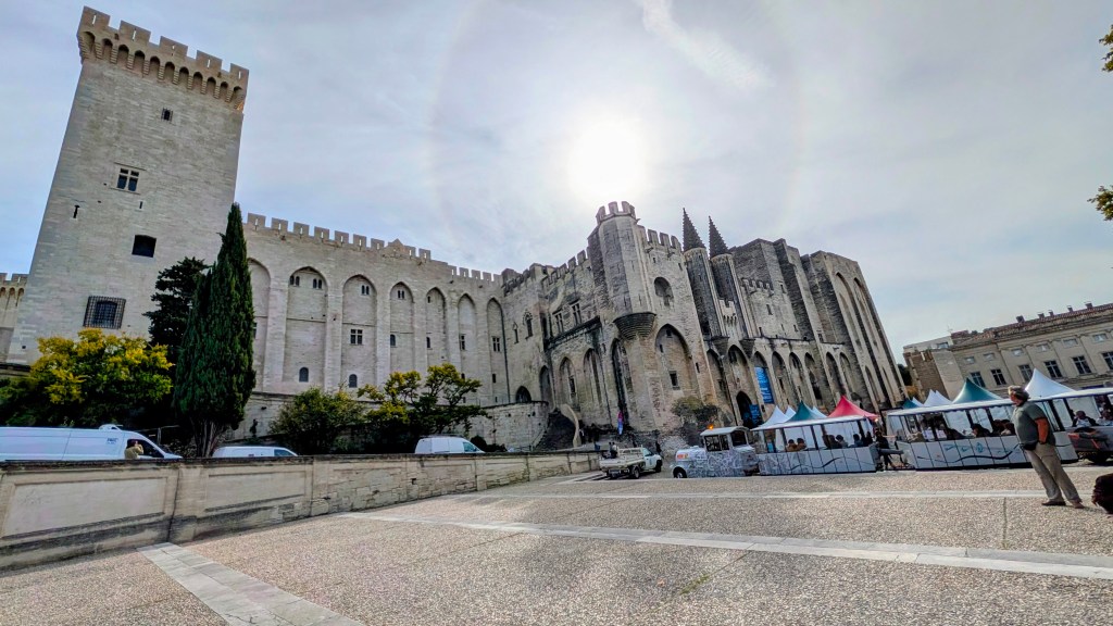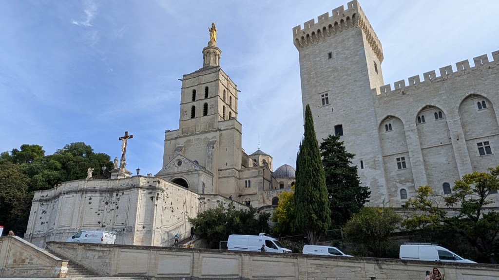 We left Arles early and headed east. On the way we stopped in Avignon, the “City of the Popes,” having served as the seat of the Catholic Church from 1309 to 1377. We parked near Place du Palais (Palace Square) a historic, lively square dominated by the 14th-century Palais des Papes (Popes’ Palace), the world’s largest Gothic palace. Once created by destroying homes to form a defensive “glacis” for the Popes, this UNESCO site is now a hub for cafes, tourists, and the famous Avignon Festival. We stopped for coffee before embarking on our tour of the city,