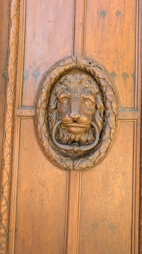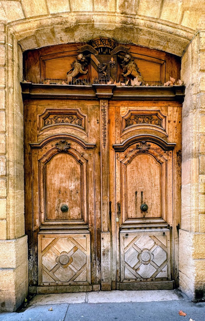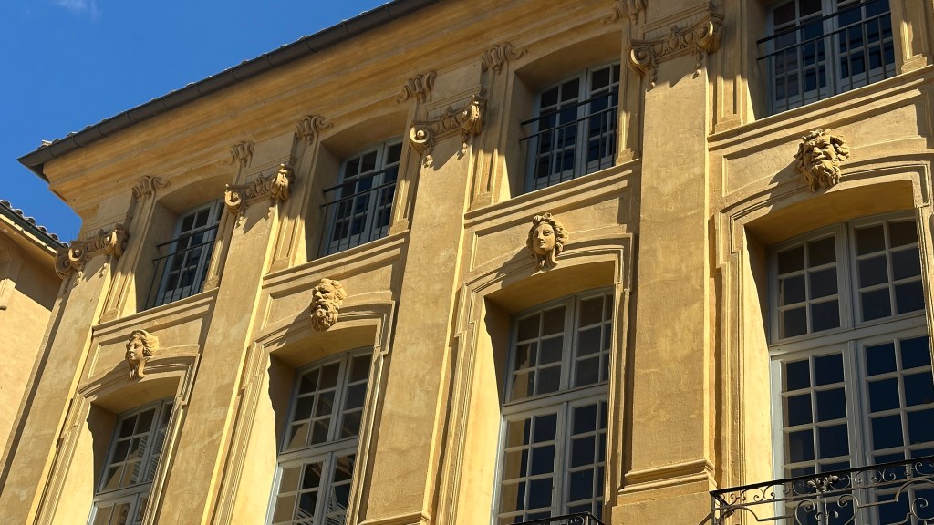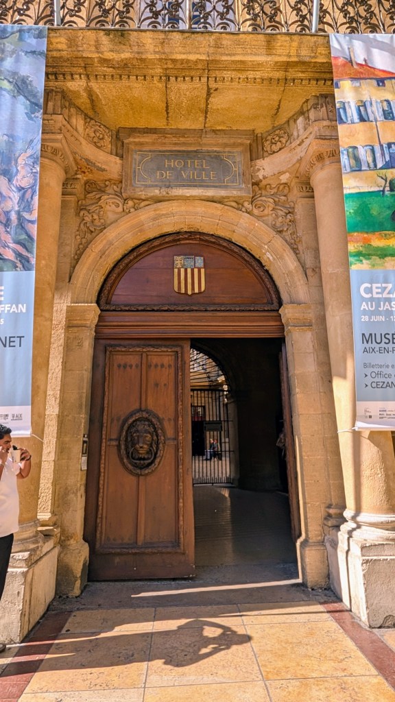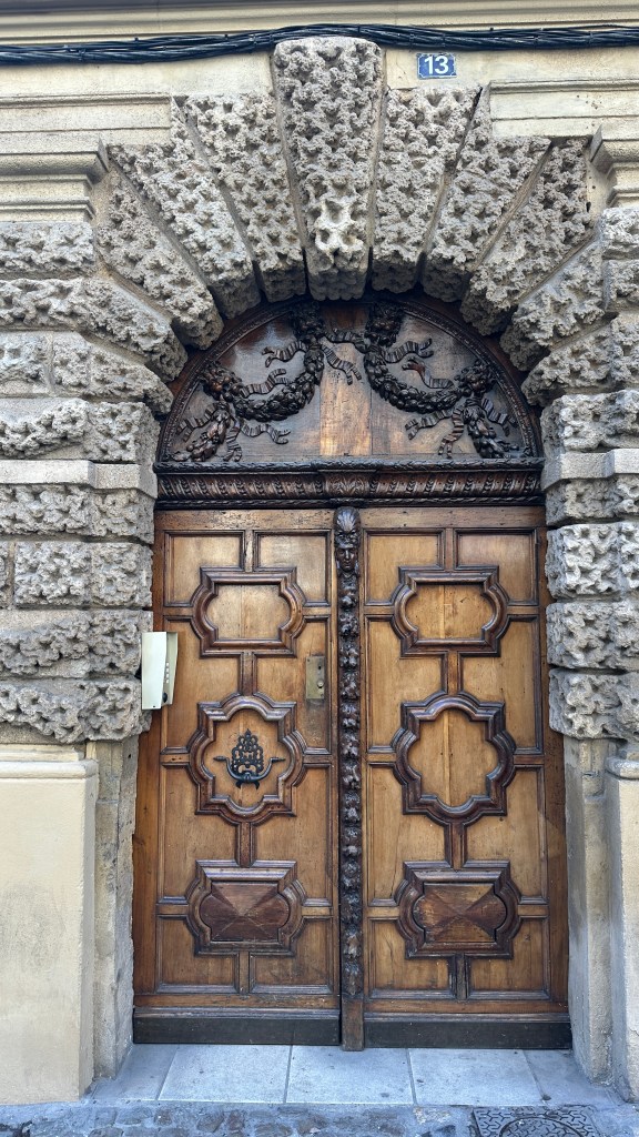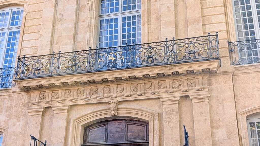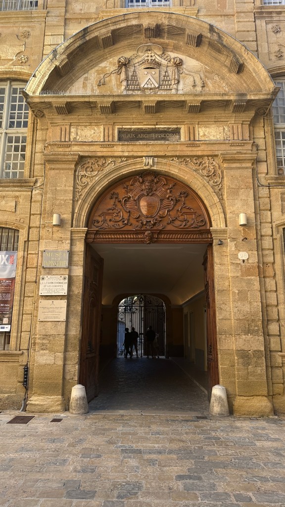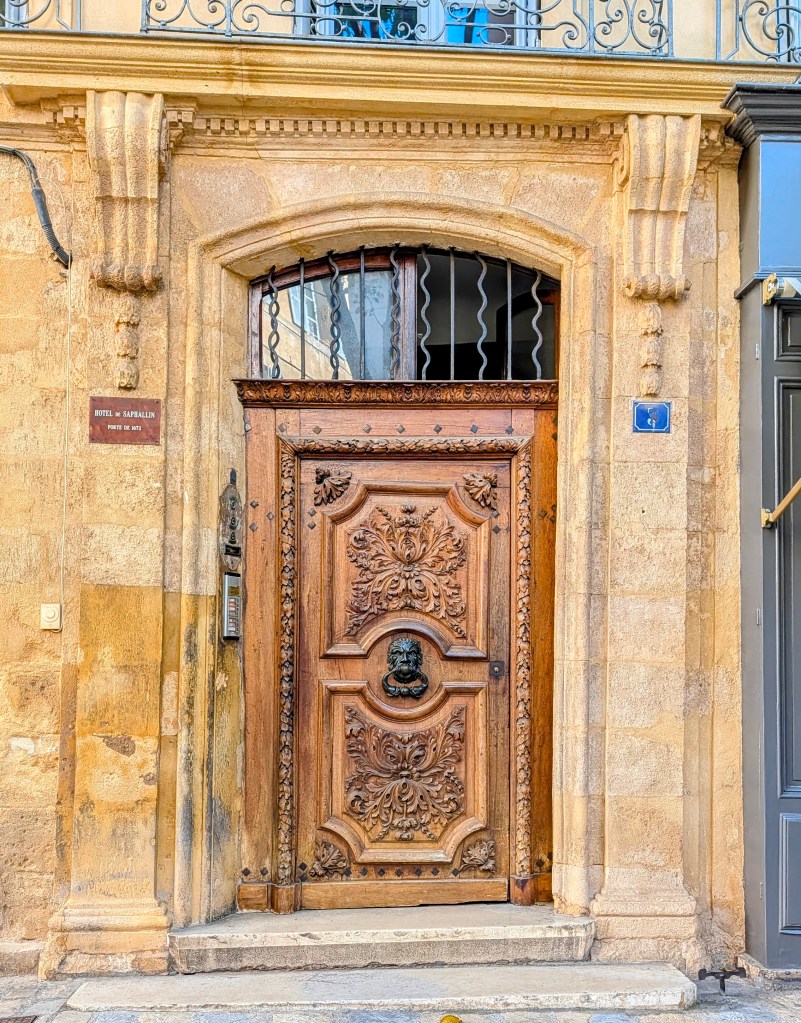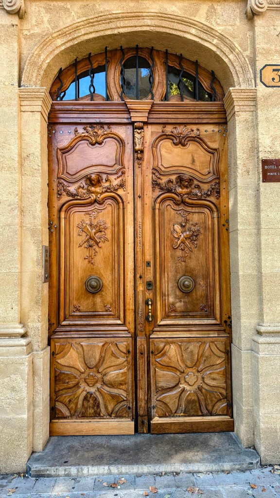 This entrance, featuring elaborate baroque architectural details and a carved wooden door, is to the Palais de l’Archevêché, which now houses the Musée des Tapisseries (Tapestry Museum).  It serves as a venue for the international music festival, Festival d’Aix-en-Provence. The building is a historic archbishop’s palace located next to the Saint-Sauveur Cathedral.