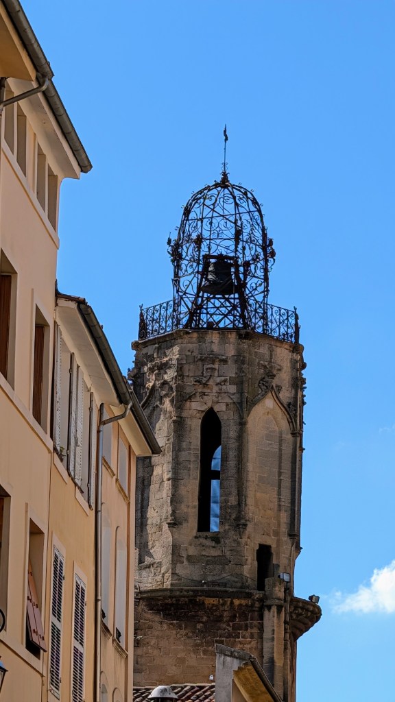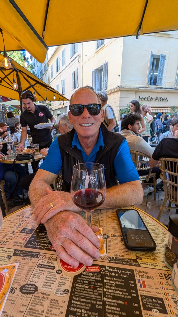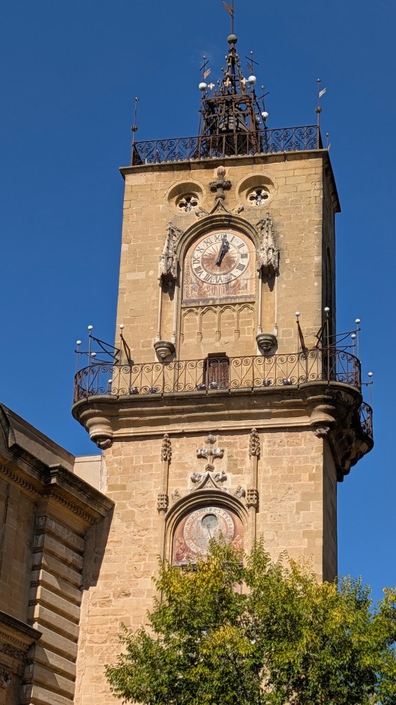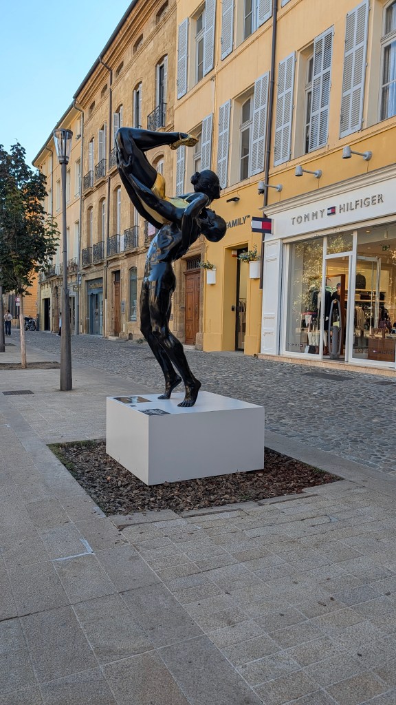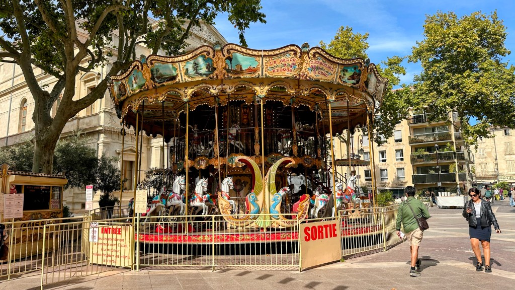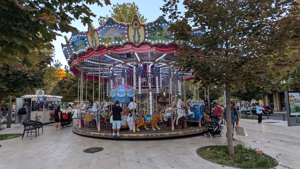 Back in Aix-en-Provence, as we headed into the old part of the city for dinner, we found yet another carousel. What is with the carousels in France? I had to look up the history. Carousels are a common and beloved sight across France, particularly in Paris and other towns like Arles, Avignon, and Aix, due to their deep historical and cultural roots in the country. The word “carousel” is derived from the French “carrousel” (from Italian/Spanish “carosello,” meaning “little battle”), which referred to elaborate equestrian tournaments and parades held by the French nobility in the 17th century. The most famous of these was held by Louis XIV in 1662 in the area of Paris now known as the Place du Carrousel.  These events led to the development of mechanical devices that simulated the experience. After King Henri II died in a jousting accident in 1559, carousels (or manèges) were adopted as a safer way for knights to practice their skills, such as spearing rings, using stationary wooden horses. After the French Revolution, carousels became more accessible to the public, allowing common people to briefly experience the feeling of nobility associated with riding on elegantly dressed horses. This made them widely popular. The late 19th and early 20th centuries were the “golden age” of carousels, with mechanical advances and elaborate craftsmanship, including figures carved by renowned French artisans like Gustave Bayol. These artistic and often unique creations have a lasting appeal. Today, these colorful merry-go-rounds serve as a source of simple amusement and a link to a romanticized past.