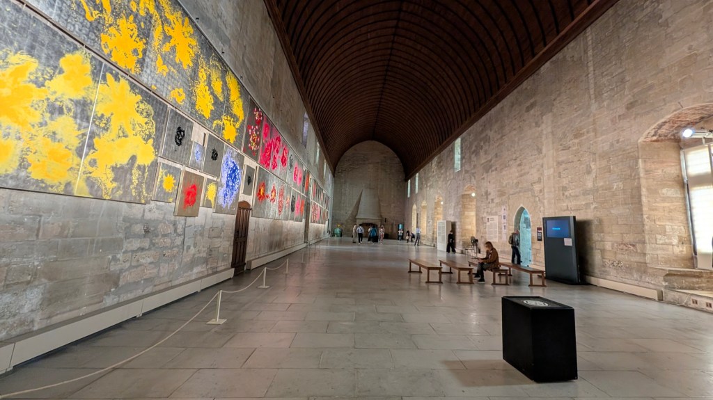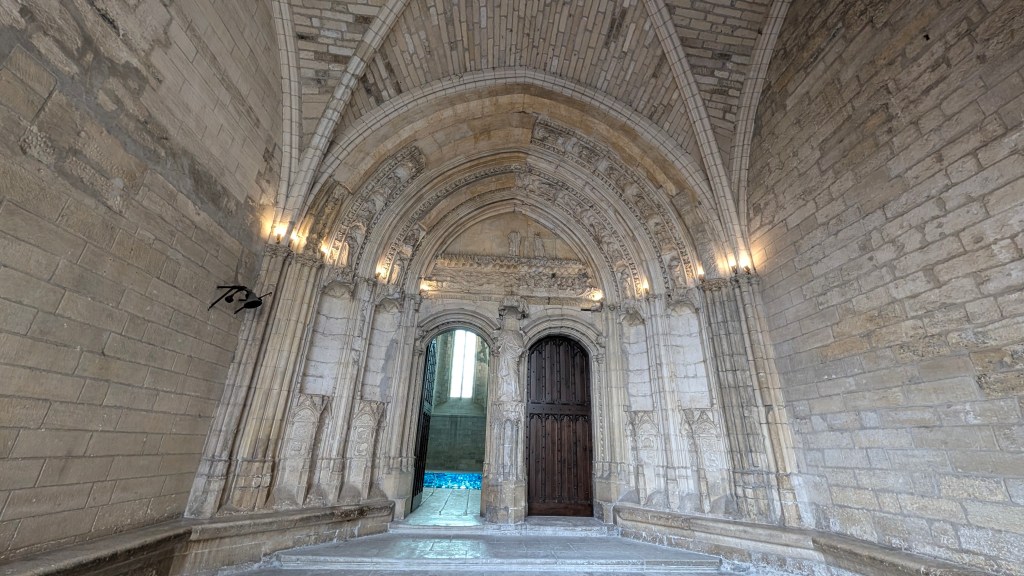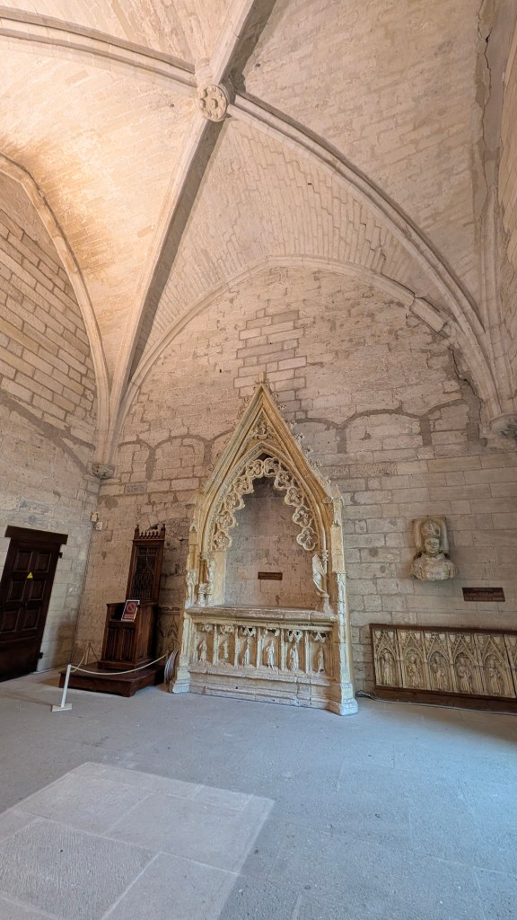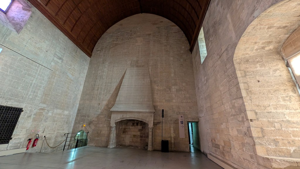 The Palace of the Popes is one of the largest, if not the largest, medieval Gothic structures in Europe.  The popes fled to Avignon in 1309 because Rome had become too dangerous due to political unrest and violent conflicts. The construct served well as a fortress, palace, and papal residence throughout the 14th century, during the Catholic schism (during which there were two popes: one in Italy, one in France) and the “Babylonian Captivity” of the Papacy. Six papal conclaves and seven Popes were maintained in the palace.
