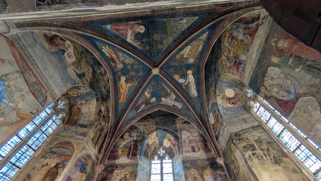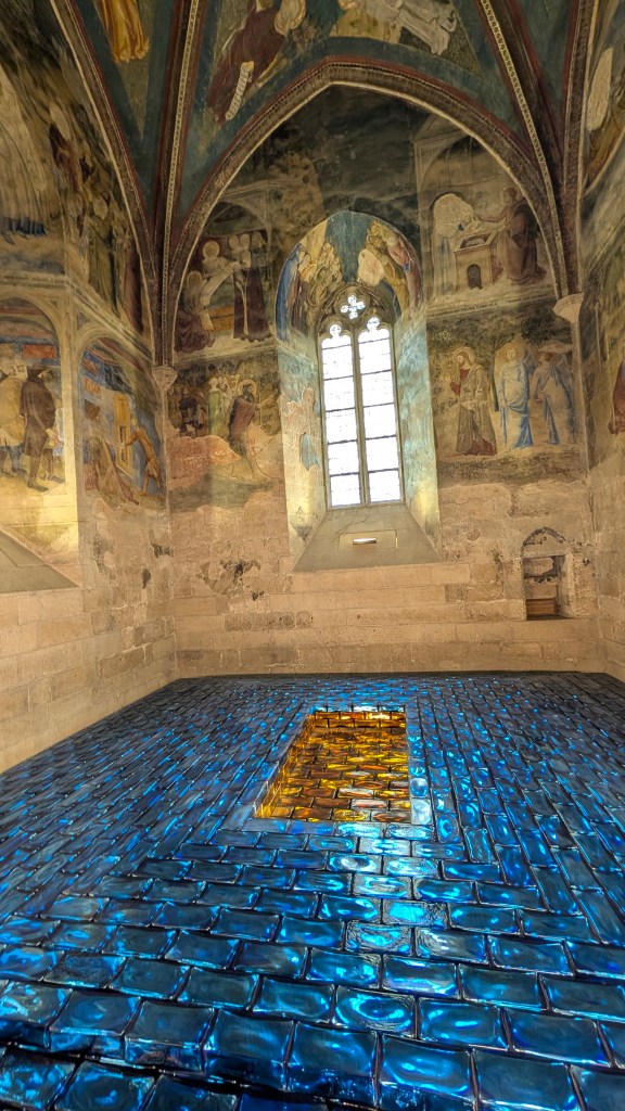 The walls are covered with remarkable 14th-century frescoes painted by famous Italian artists like Matteo Giovanetti. The floor below is another installation by Othoniel.