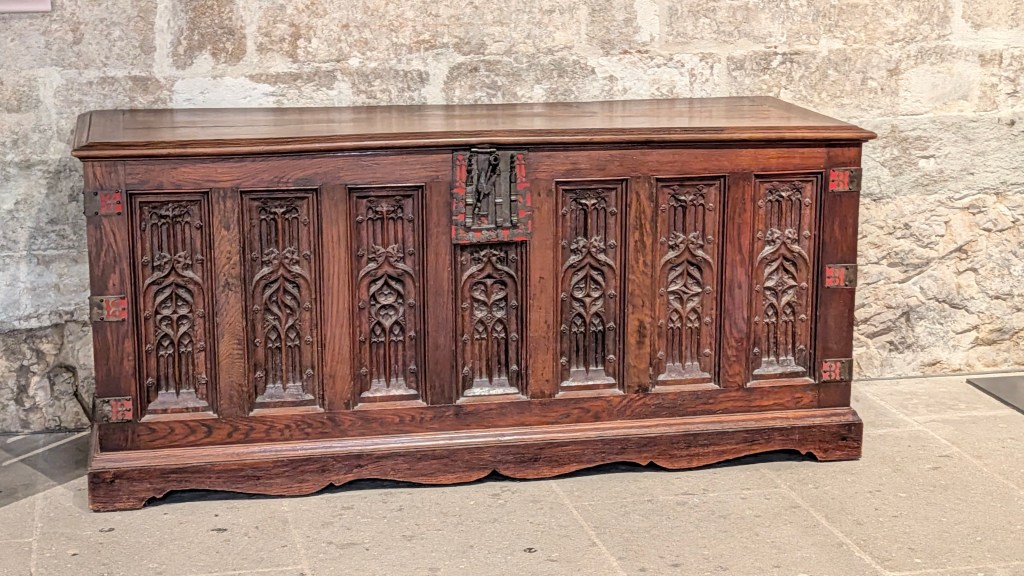 Today, most of the palace is unfurnished, focusing on the impressive architecture, though some 14th-century frescoes remain. This lone chest remains.