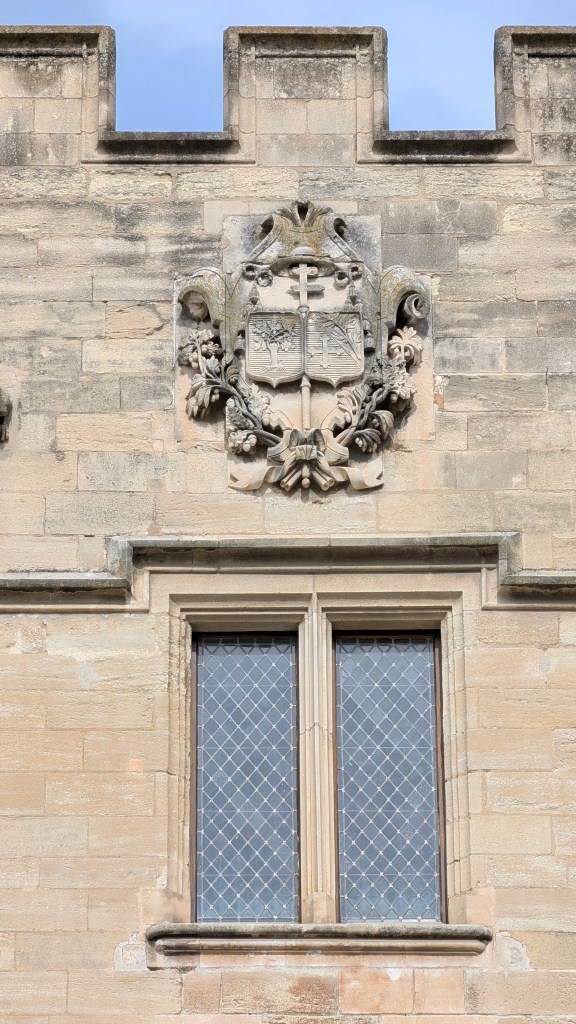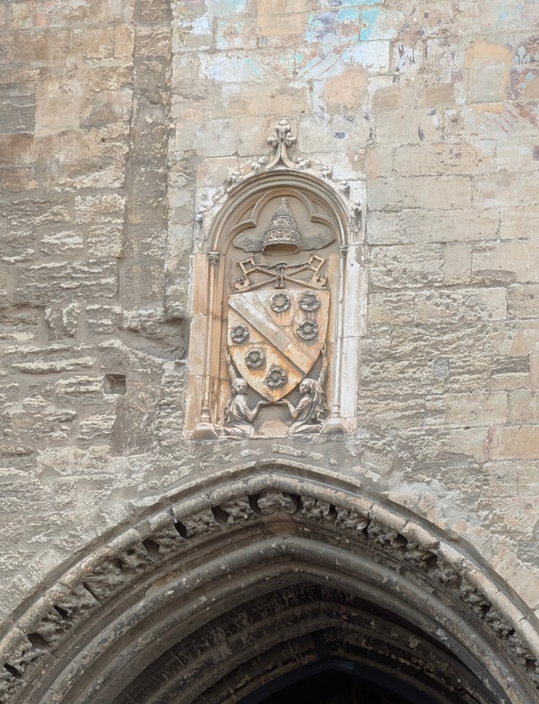 The papal coat of arms is that of Pope Clement VI. The shield belongs to the Roger de Beaufort family, to which Clement VI belonged. Above the shield is the papal tiara, and behind it are the crossed keys of Saint Peter, symbolizing the authority of the Catholic Church.