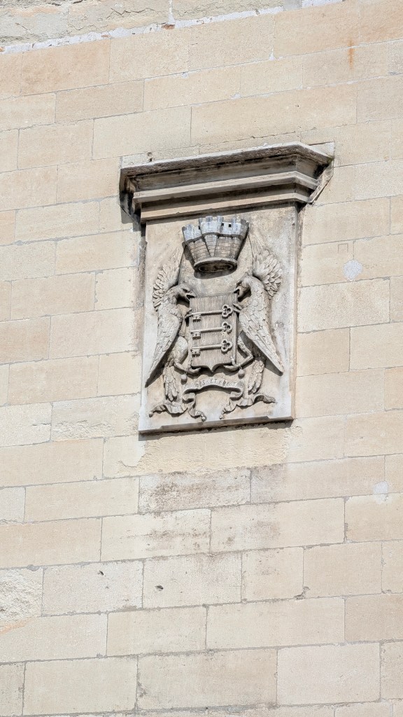 On the ground in the center of Place de l’Horloge is a mosaic of the coat of arms for the city of Avignon featuring keys and flanked by eagles.