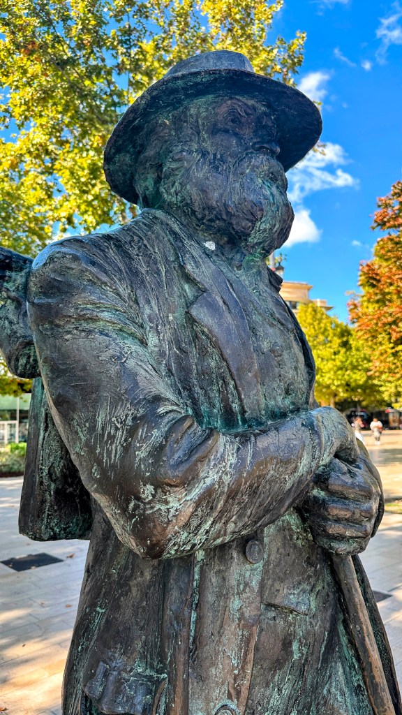 Across the street on the side opposite Cours Mirabeau stands a Statue de Paul Cézanne (Statue of Paul Cézanne). Sculpted by Dutch artist Gabriel Sterk, the statue was gifted to the city in 2006 for the centenary of Cézanne’s death. Cézanne stands over 6 feet in height and is in his usual work jacket, boots laced for walking, hat pulled low over his brow, like he is halfway between a hike and a painting session. Backpack slung and walking stick in hand, he could be sizing up a canvas or just deciding where to eat.