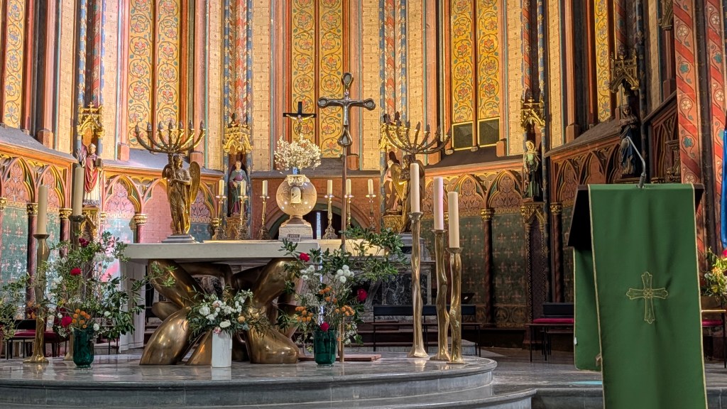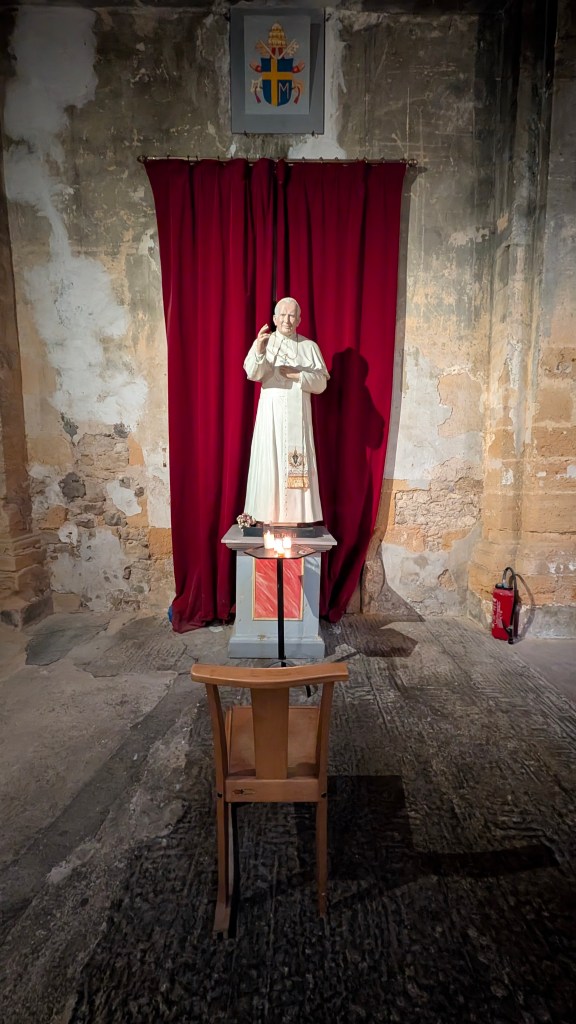 and a stone altar with an altar piece by Umberto Boccioni. The original vestments and hat of Cardinal de Pres hang in a glass covered cabinet on the wall. They carry their age very well