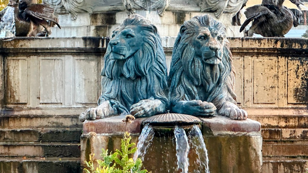 Lions lounge around its edge like they own the place, while bronze children cling to swans mid-ride, adding just the right touch of misdemeanor.
