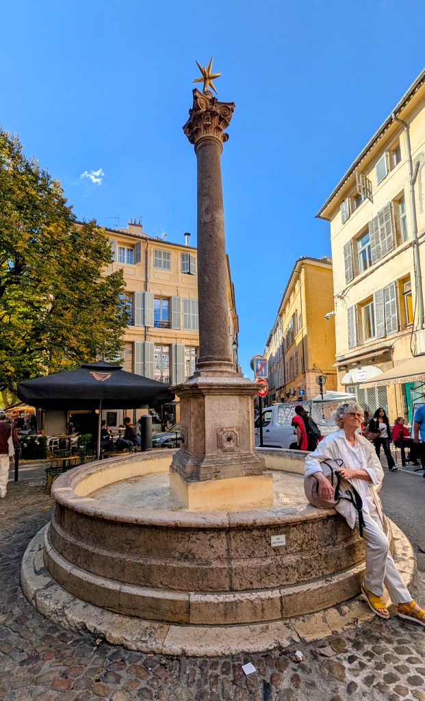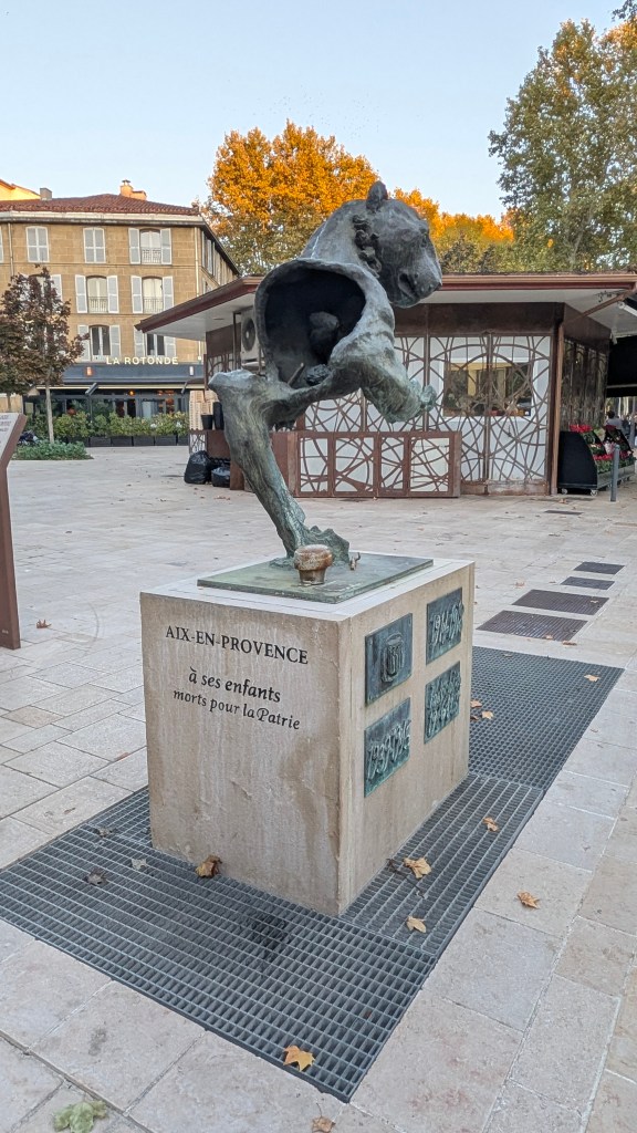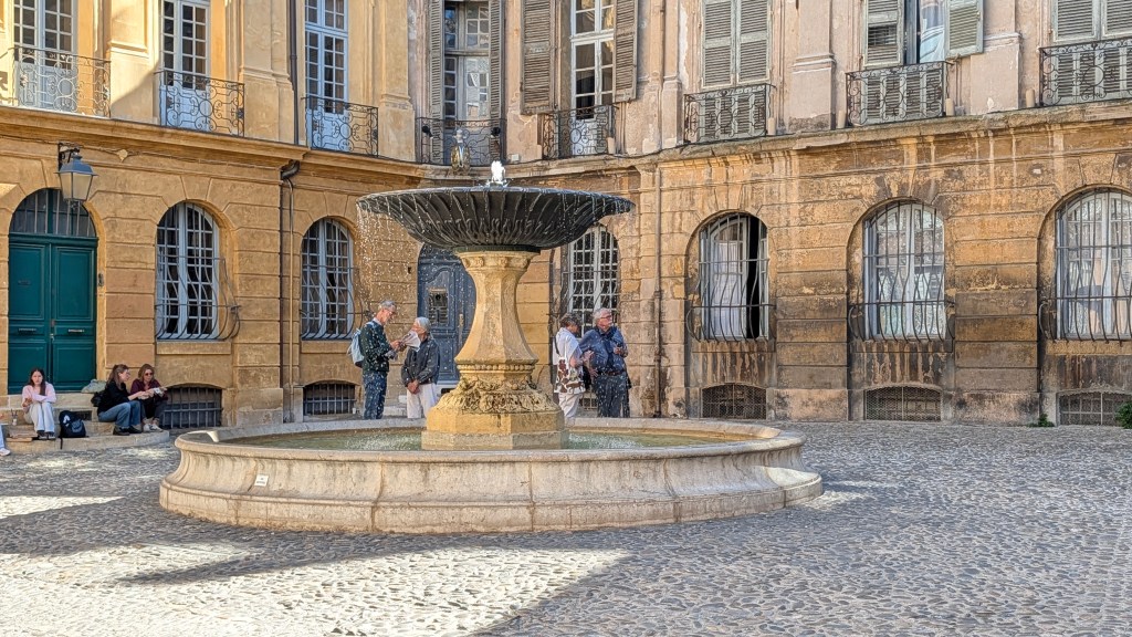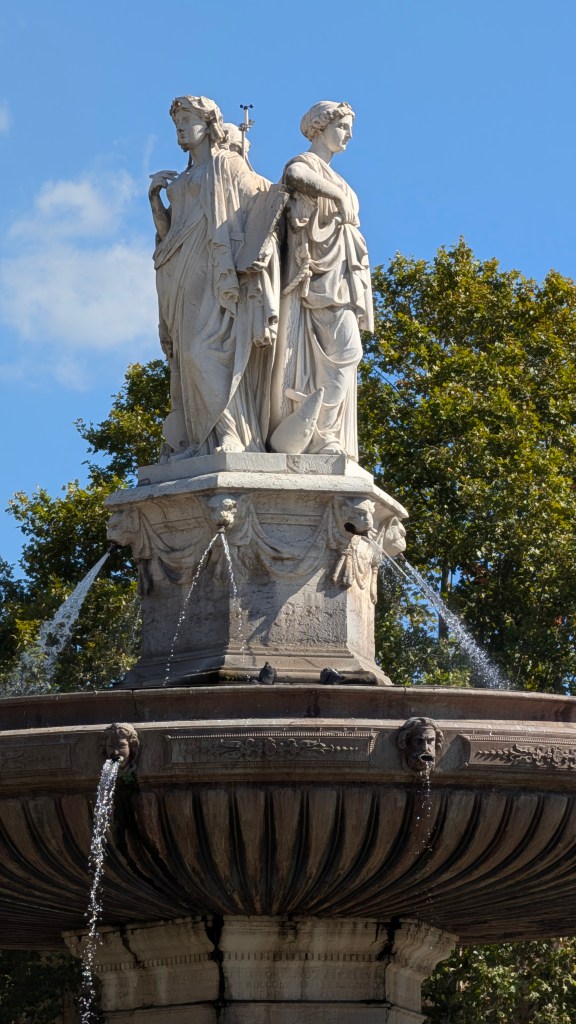 In the morning we embarked on the journey of fountains, and other things. First stop: Fontaine de la Rotonde (Fountain of the Rotunda). When Count of Valbelle left Aix-en-Provence in 1779, he gifted the city a generous parting gift: 30,000 livres, which was the currency at the time. The city decided to put that money to work. It took a while in the planning stages, but in 1860 the most iconic splash zone in town got born: the Fountain of the Rotunda. Long known for its love affair with water, from Roman baths to bubbling neighborhood spouts, Aix needed a proper fountain to fortify its reputation. The Rotunda Fountain delivered. Towering nearly 40 feet, it was the first in the city to feature a cast-iron basin.