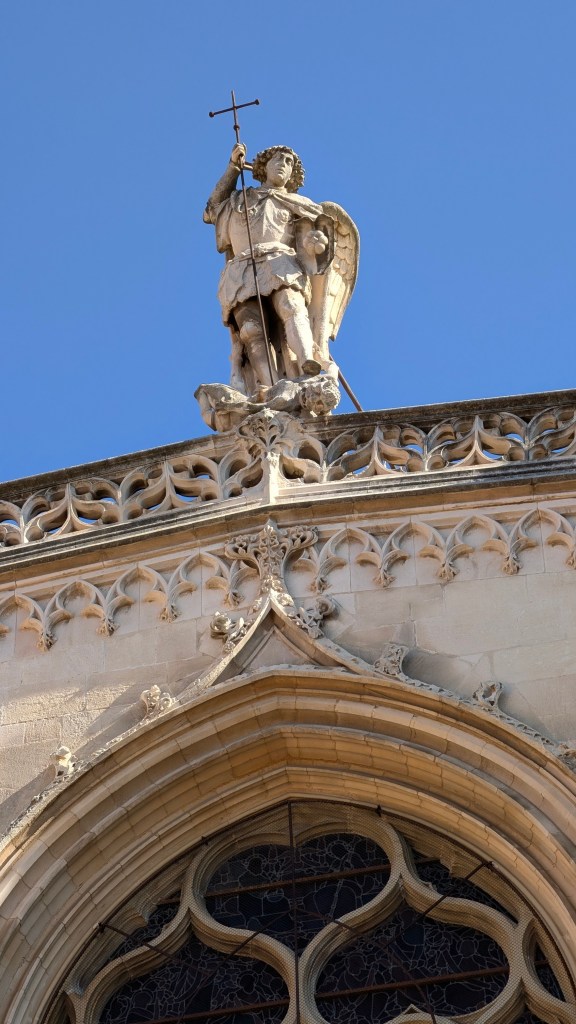 On the roof is a statue of Saint Michael the Archangel vanquishing Satan.