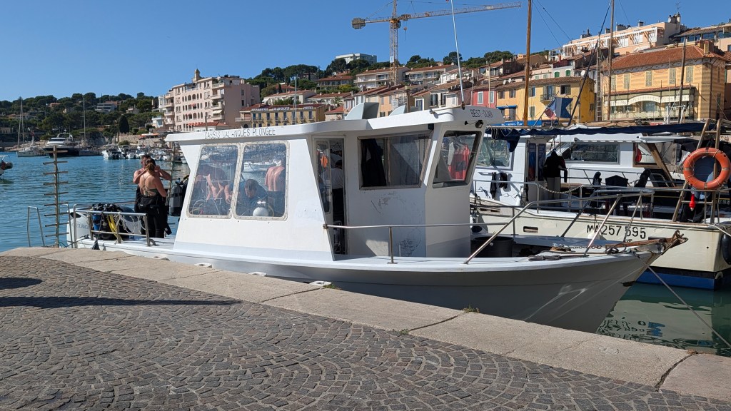 We saw a dive boat gearing up to go out. In 1991, diver Henri Cosquer discovered the Cosquer Cave near Cassis, a submerged cave containing prehistoric cave paintings from 27,000 to 19,000 years ago.