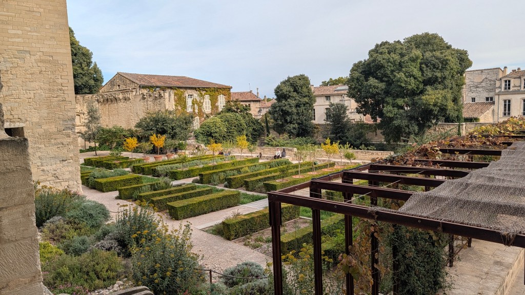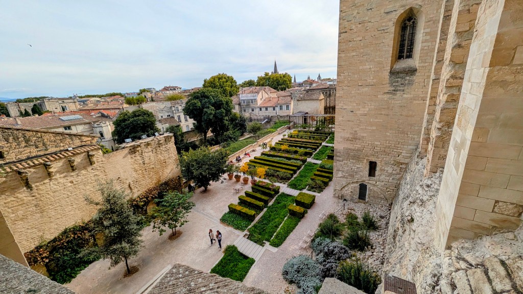 The papal garden, originally designed in the 14th century, has been recreated using medieval-style landscaping arranged with large rectangular beds planted with Mediterranean species known to have grown there in the 1300s.