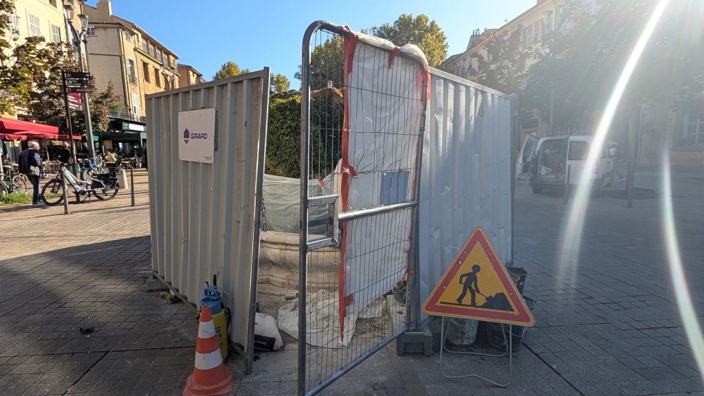 Fontaine des Neuf-Canons (Fountain of the Nine Cannons), currently under renovation (but I include it due to its interesting history),  was constructed in 1691, and was named for the nine cannons that shoot water into the basin. The fountain was built to provide water to sheep as they passed through the area. At that time, an easement authorized herds of sheep on transhumance between the commune La Crau and the Alps to come and drink there. The fountain was partially destroyed in 1944 during the liberation of Aix-en-Provence. An American tank had taken away one of the four lobes of the basin, this arm was not rebuilt, and its opposite lobe was, on the occasion of this incident, suppressed.