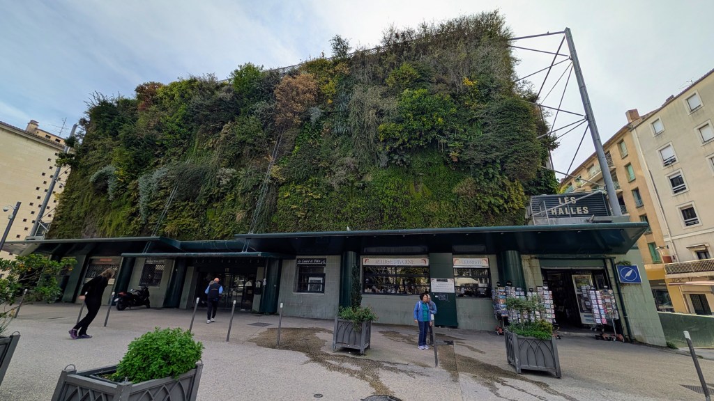 Nearby on Pie Square is Les Halles d’Avignon (Avignon Market Halls), a vibrant marketplace that has become synonymous with the city’s gastronomic culture. The origins of Market Halls trace back to the 16th century when the land, once owned by a man executed as a heretic, was designated for a covered market. Though construction was slow, the market hall was eventually completed in 1624, featuring not just shops but also a guardhouse and a chapel. Over the centuries, the market evolved, with major redevelopment projects taking place in the 19th and 20th centuries. Throughout its history, Market Halls has undergone numerous changes, including a roof redesign in the 1920s and various structural modernizations in the mid-20th century, adapting to the shifting commercial landscape with the advent of supermarkets and the subsequent need for downtown revitalization. A unique feature of Market Halls is the impressive 600 square meters green wall on the north façade, designed by botanist Patrick Blanc, which adds to the market’s distinct allure and serves as a significant city attraction.