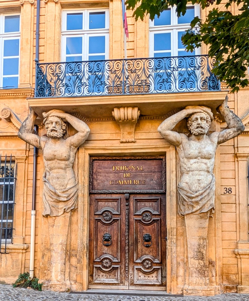 The Hôtel Maurel de Pontevès, constructed around 1650, originally served as a private mansion.  It currently houses the Tribunal de Commerce (Commercial Court) of Aix-en-Provence.  The entrance is famously flanked by two large stone atlantes statues holding up the wrought-iron balcony.