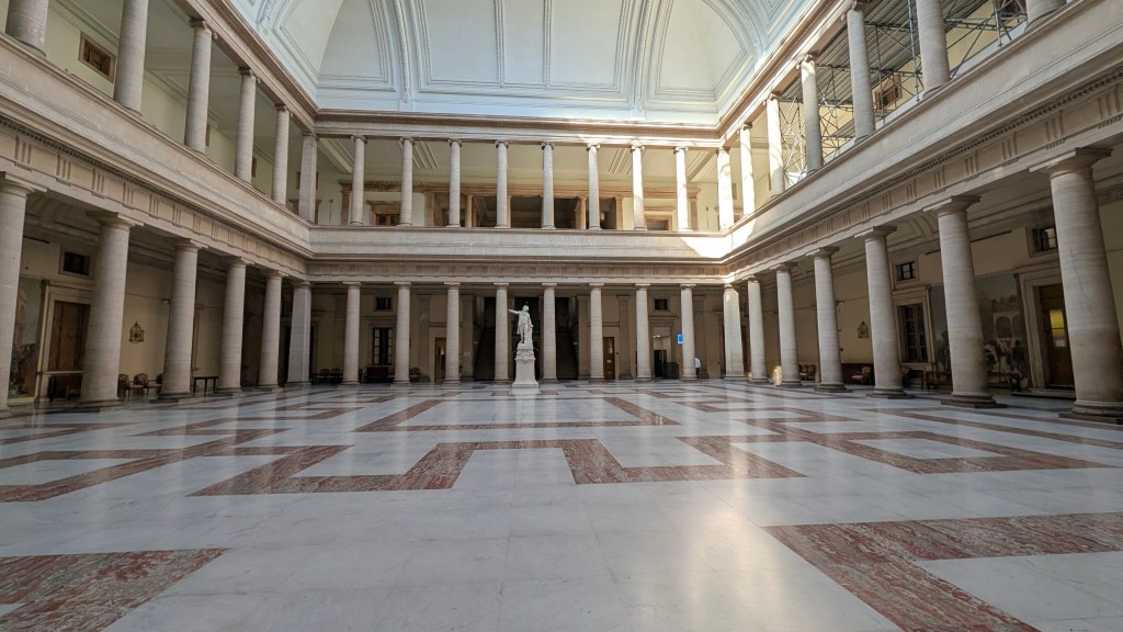 The interior hall of the Palais de Justice (Palace of Justice), constructed between 1822 and 1832, features a distinctive neoclassical design characterized by a colonnaded courtyard.