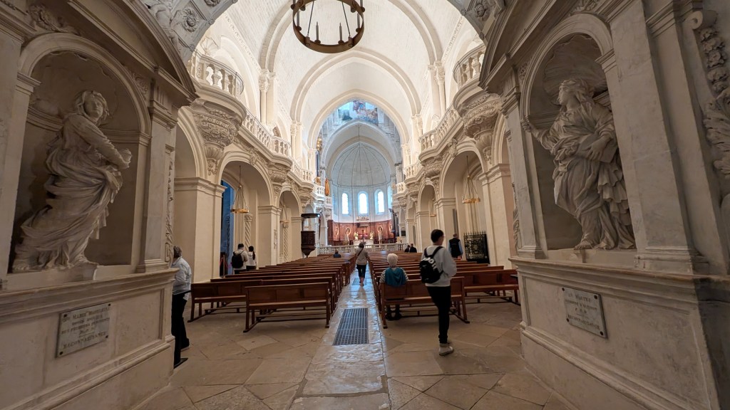 The style might be an architectural stew of mostly provencal Romanesque, mixed with Greek, Roman, Gothic and Baroque elements. Some inner chapels were added in the 14th century, during the time of Pope John XXII, second Pope of Avignon. The donated bells are a 35-strong carillon.