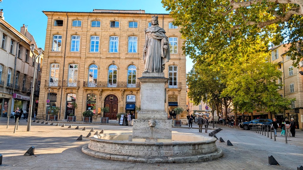 Fontaine du Roi René, features a marble statue of René of Anjou, who was known for promoting learning and art in the region. It was designed by architect Pierre-Henri Révoil and erected in 1819.  The King is depicted holding a scepter and a bunch of Muscat grapes, a variety he introduced to Provence.