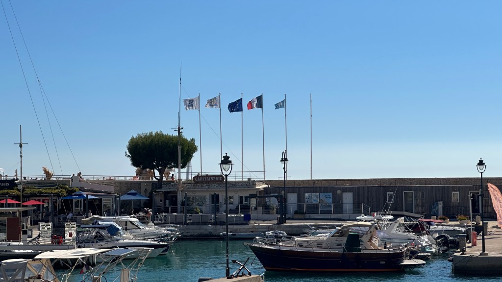 The flags are flying in front of the capitainerie (harbor master’s office).
