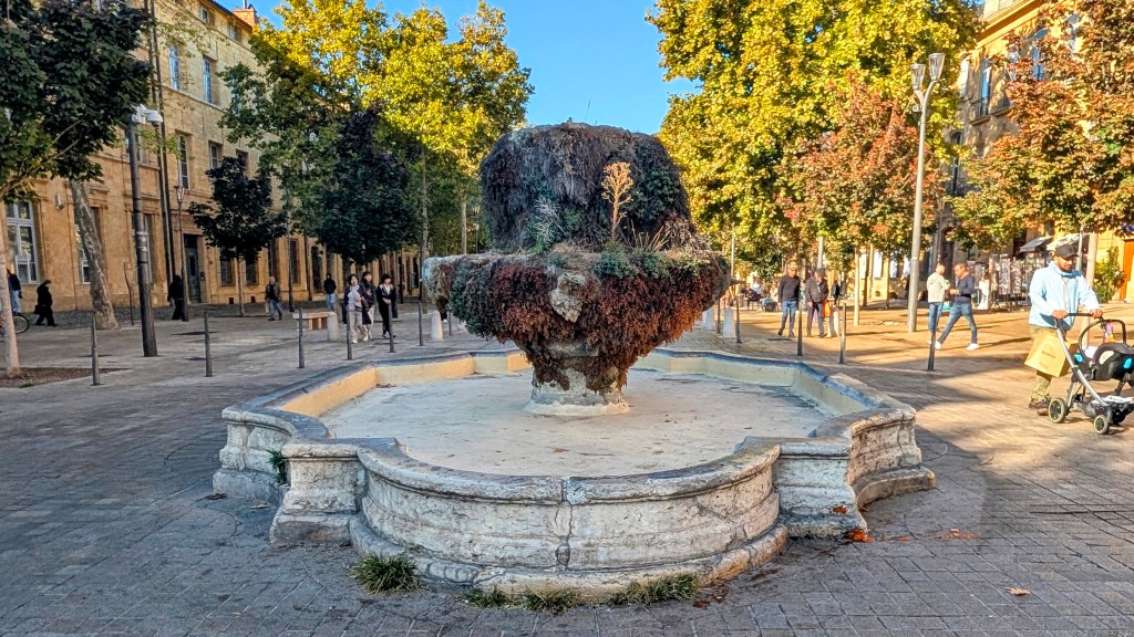 Located on the Cours Mirabeau is the Fontaine Moussue (Mossy Fountain), also known as the “Big Green Sponge” due to its unique appearance. Built in 1667, the first on the boulevard, it is is covered in thick moss and vegetation, which thrives on the warm, mineral-rich thermal water that flows through it at 65° F.  The Mossy Fountain has suffered from calcification, which makes the design difficult to see. It is believed that the shapes under the limestone deposits are four children holding a basin for the water.