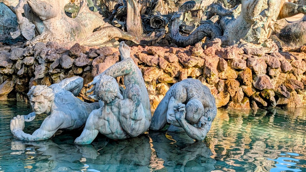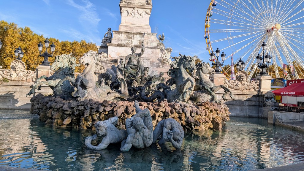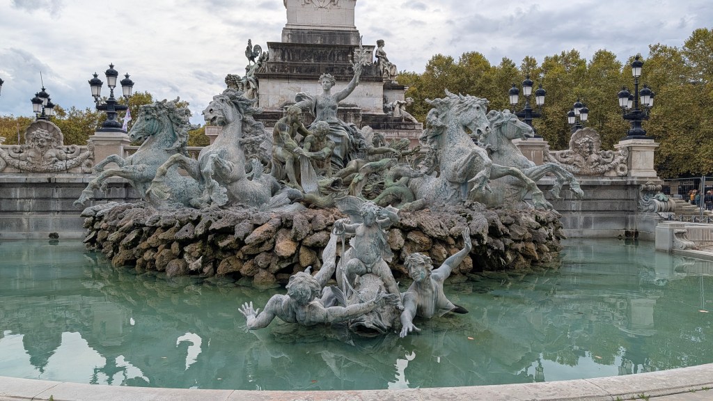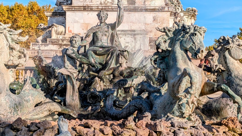 During the German occupation in 1943 the bronze sculptures were dismantled by the Nazis to be melted down for weaponry. They were saved by French workers who hid them in a factory in Angers. The statues were rediscovered in 1945 and eventually returned to Bordeaux. The fountain remained “empty” for decades until the statues were finally reinstalled in 1983.