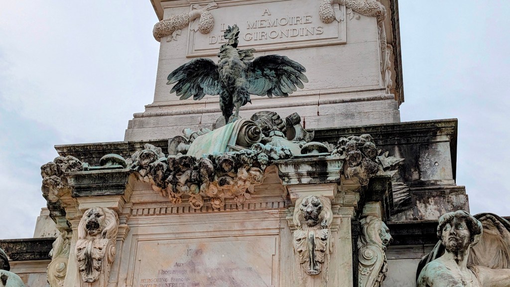 Our tour of the city of Bordeaux was with Sarah who met us in our lobby at Villas Fuchs. As we walked across the street Sarah told us that the city is now a UNESCO World Heritage site because of the large number of 17th century buildings still standing. The 17th century was the boom time for this city. We started in front of the Monument aux Girondins (Girondines Monument), a tribute to the revolutionaries, located in the Place des Quinconces, covering 40 acres, it is one of the largest city squares in Europe. The monument was built between 1894 and 1902 to honor the Girondins, a moderate political faction who were arrested and beheaded in 1793 after losing a power struggle during the French Revolution to the more radical Montagnards because they had not killed the king.