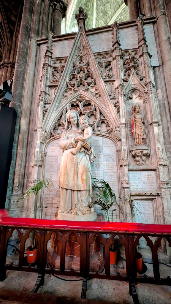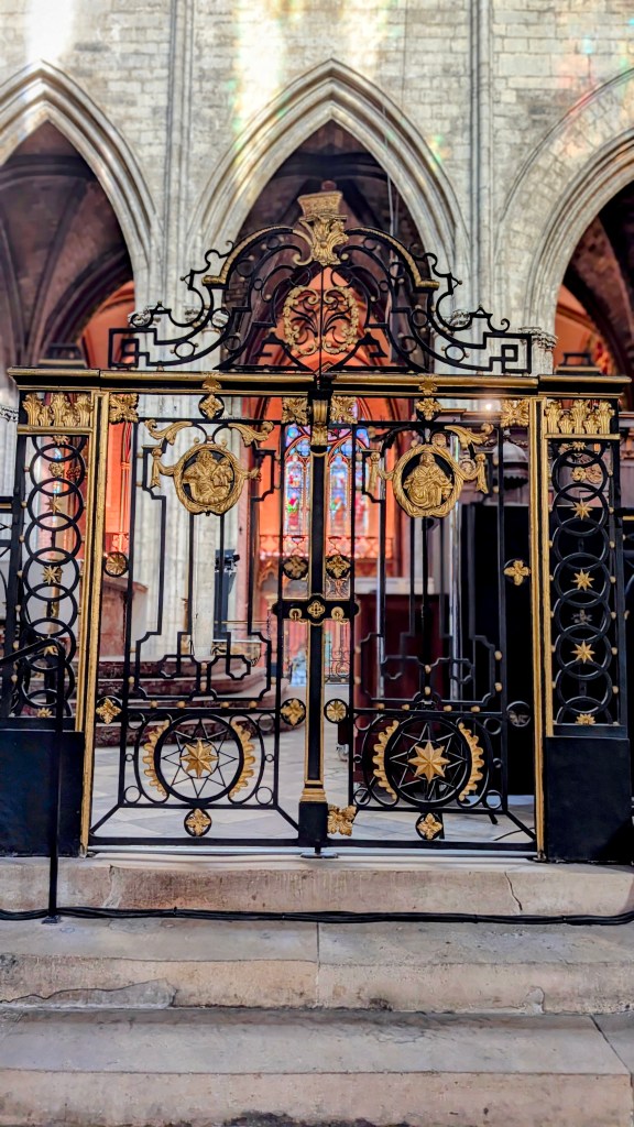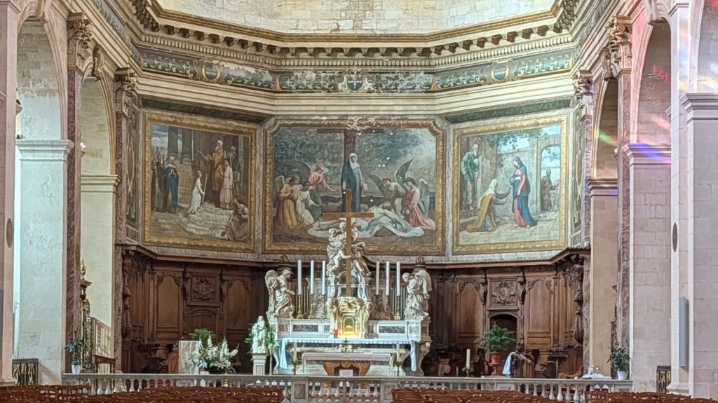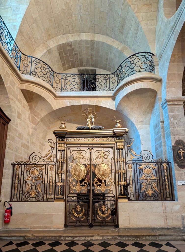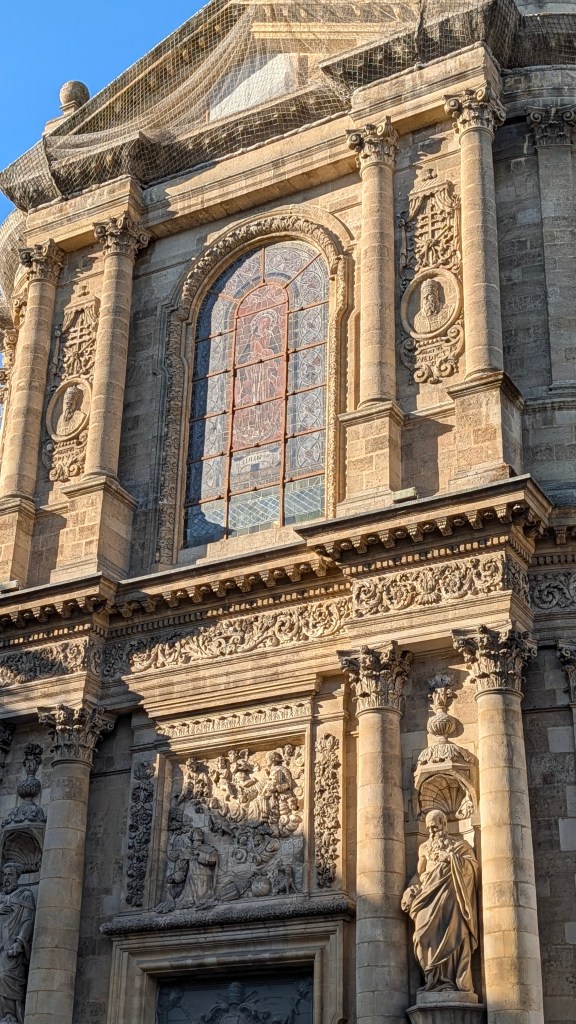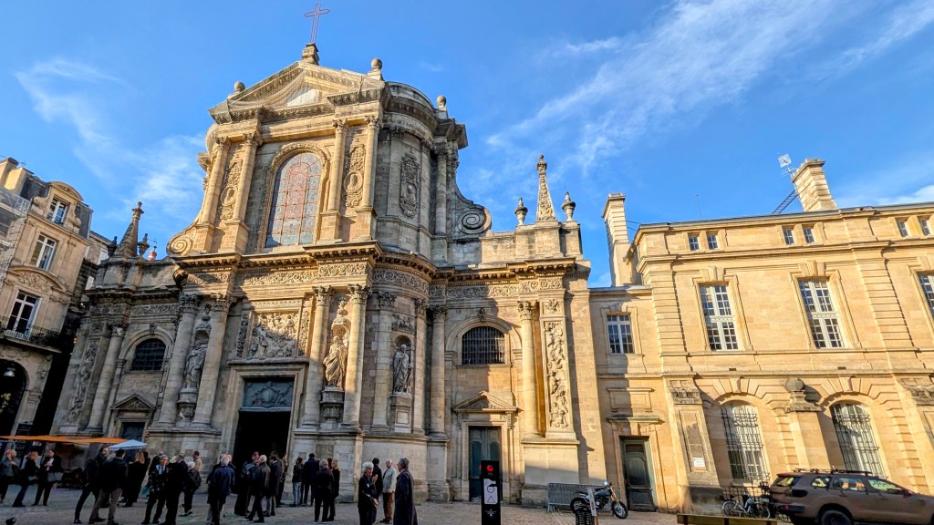 Sarah directed us to Place du Chapelet where we found Église Notre-Dame de Bordeaux (Notre Dame of Bordeaux Cathedral), a Baroque church constructed in the late 17th century. It is dedicated to the Virgin Mary. It was part of a 13th-century Dominican monastery; the adjacent, formerly ruined cloister was restored and is now the Cour Mably. The original church was demolished in 1675 by order of Louis XIV as part of urban planning changes, leading to the construction of the current church.
