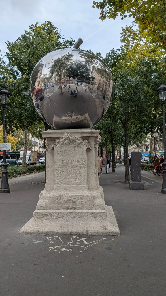 The next day we all road the train back to Paris where we parted ways. Eric and I continued on the metro to Montmartre, a historic hilltop neighborhood in Paris’s 18th arrondissement. Upon emerging from the metro we were greeted by a statue entitled “La Quatrième Pomme” (The Fourth Apple). Being New Yorkers, we could not resist a pic of “The Big Apple.” The sculpture was created by French artist Franck Scurti and inaugurated in 2011. It serves as a tribute to the 19th-century French philosopher and socialist Charles Fourier, referencing his concept of the “fourth apple” in relation to industrial society.