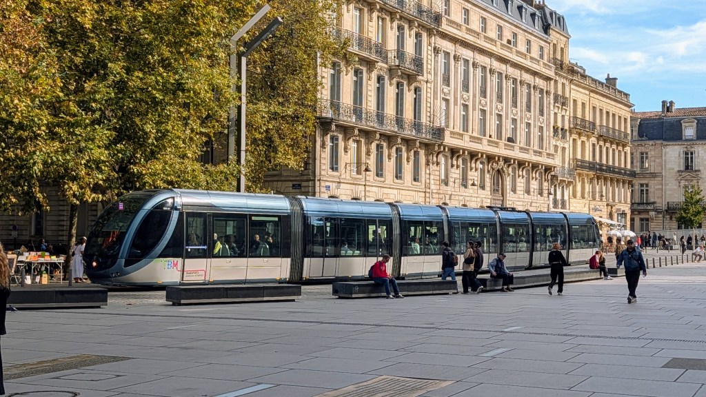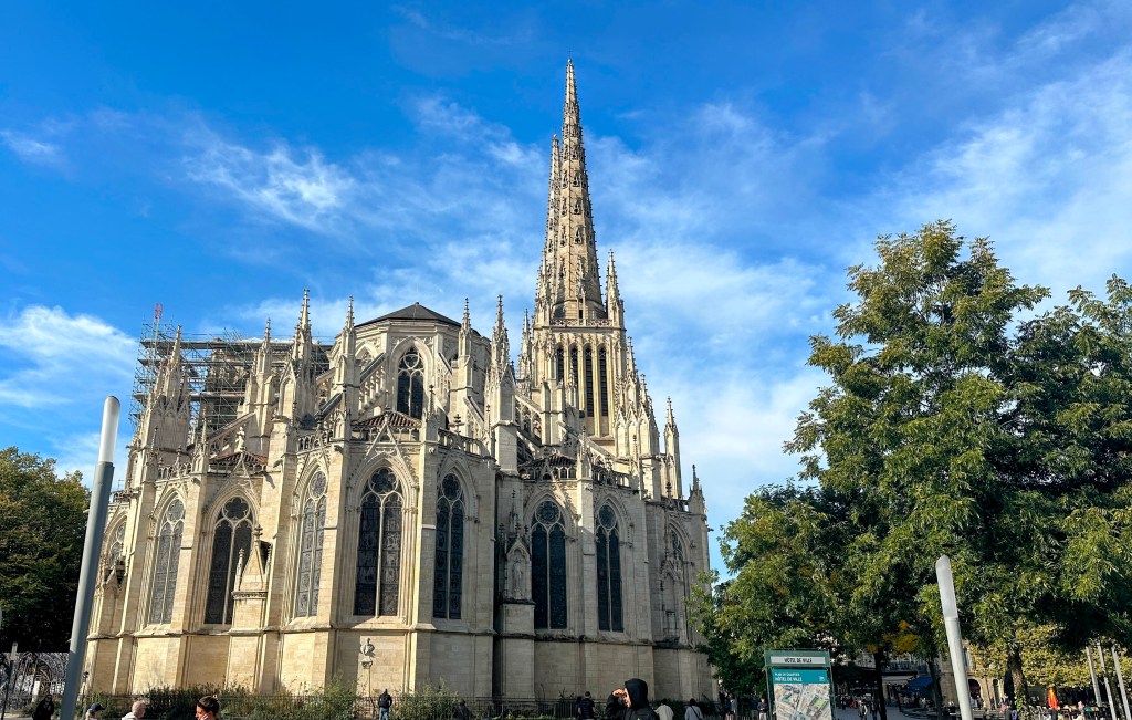 The tram passes directly behind the cathedral. To preserve the historic center, Bordeaux implemented a ground-level power supply system in the 2000s, making it the first city in France with a fully wireless tram in its core