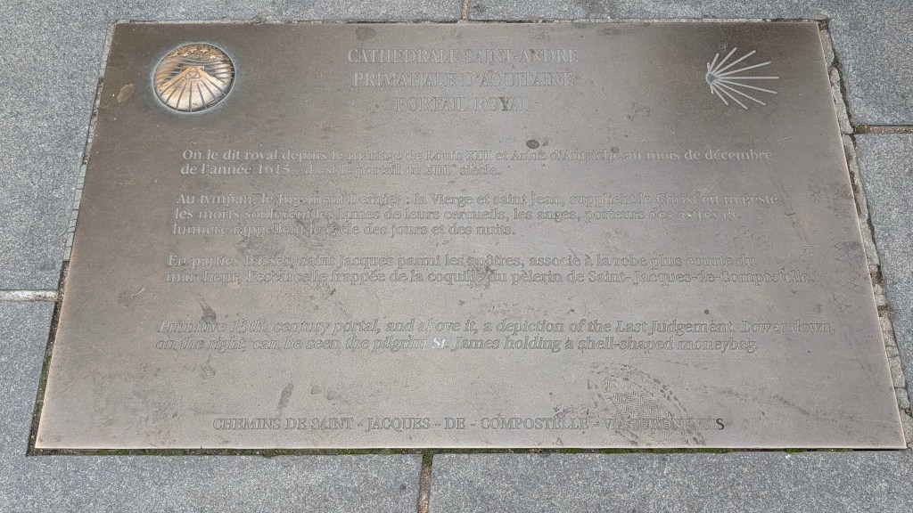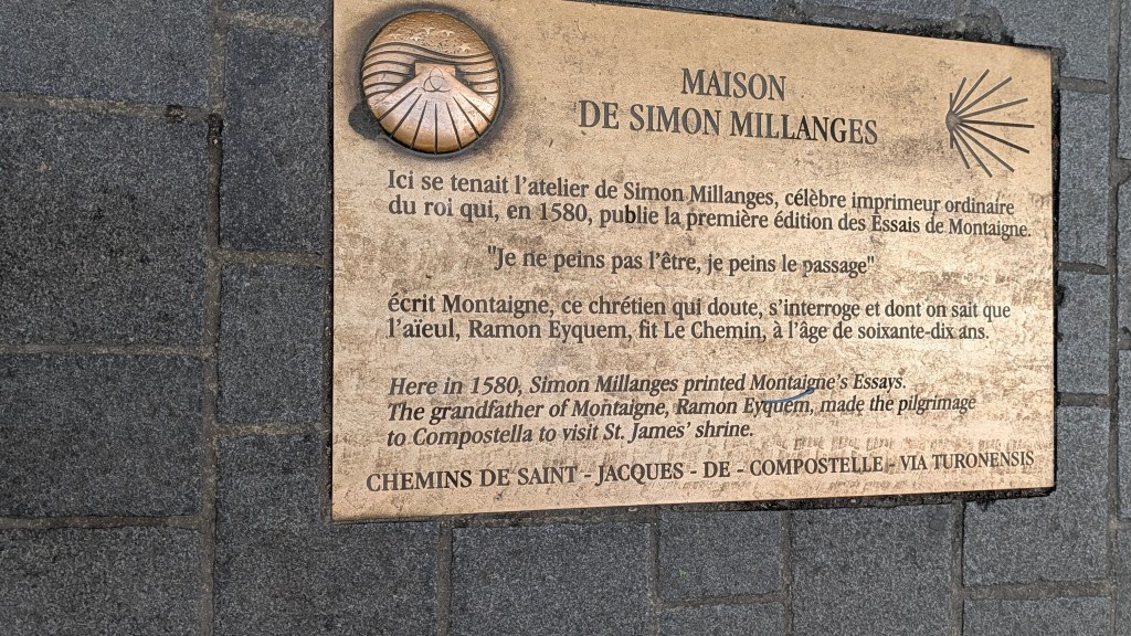 This plaque commemorates the site of Simon Millanges’ printing workshop, where the first edition of Montaigne’s Essays was published in 1580. Millanges was printer to the King. Montaigne preached tolerance and invented the style of essay writing. The plaque features a famous quote from Montaigne: “I do not portray the being, I portray the passing.” It also mentions that Montaigne’s grandfather, Ramon Eyquem, made the pilgrimage to Compostella via the Via Turonensis route.