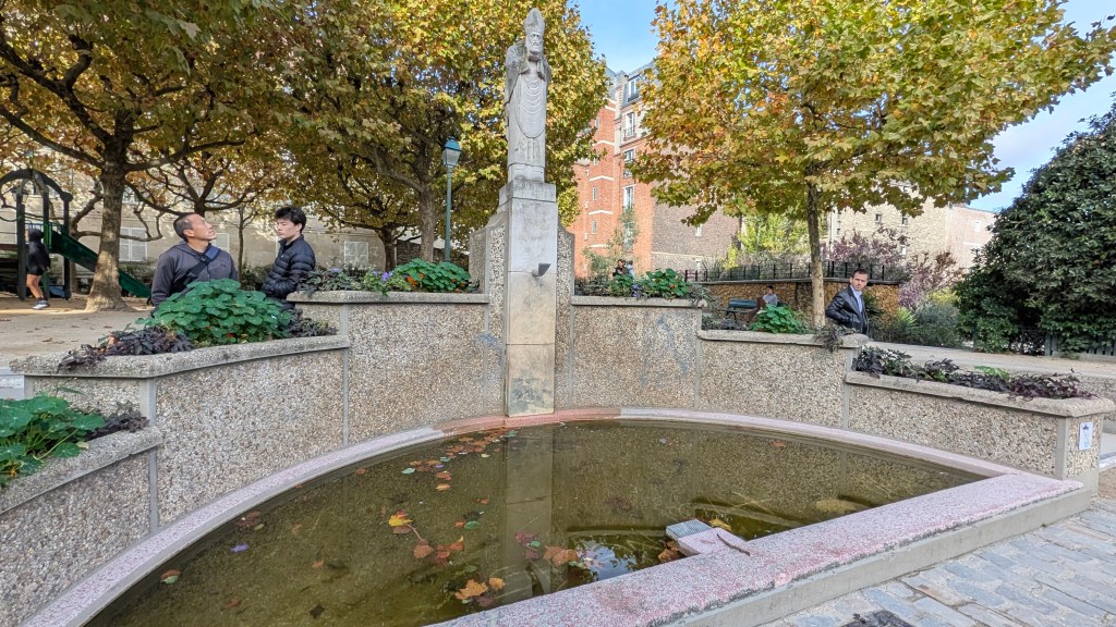Around 250 AD Saint Denis, patron saint of Paris, was decapitated by the Romans soldiers nearby for the crime of converting citizens to Christianity. Paris was pagan until the 4th century. Legend holds that once beheaded, Saint Denis walked nearly four miles carrying his head before stopping to wash it in this fountain in the Square Suzanne Buisson, the site traditionally believed to be the spot where this miraculous event occurred. The statue depicts Saint Denis holding his own severed head in his hands. The current statue was installed in 1941, but the fountain itself is much older and was historically believed to provide holy water.