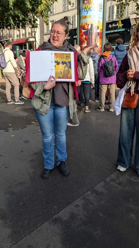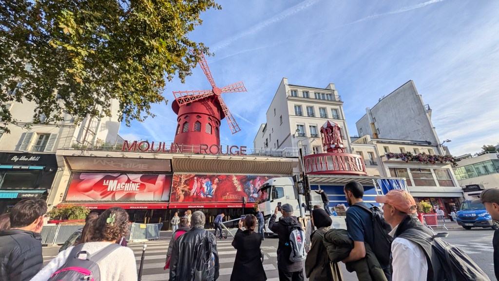 Elise took us first to Moulin Rouge cabaret located on the Boulevard de Clichy. She explained that although it had been built in 1889 by Charles Zidler and Joseph Oller, the iconic red windmill was gifted later, in 1899, the same year in which the Eiffel Tower was built. It is famously known for the can-can dance and as the birthplace of modern cabaret, but also historically significant, it was the first building in the city powered by electricity. It had to be outside the city because of how risqué it was considered. But the cabaret has hosted famous patrons including Sigmund Freud, Oscar Wilde, and the Prince of Wales.