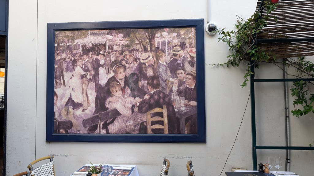 There can be found a reproduction of “Bal du moulin de la Galette” (Dance at Le Moulin de la Galette), a famous painting by Pierre-Auguste Renoir. The lady in pink is thought to have been his mistress. The straw hates depicted represent the working class.