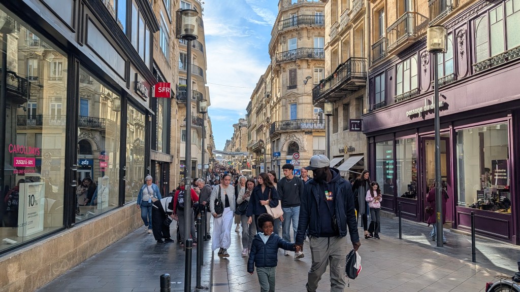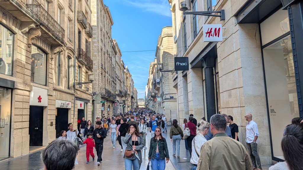 Rue Sainte-Catherine, originally part of the Roman way, is a mile long artery known as one of Europe’s longest fully pedestrianized shopping streets. Running from Place de la Comédie and the opera to Place de la Victoire, it serves over 230 shops, houses underground rivers. Sarah told us on a Saturday afternoon it is teen central.
