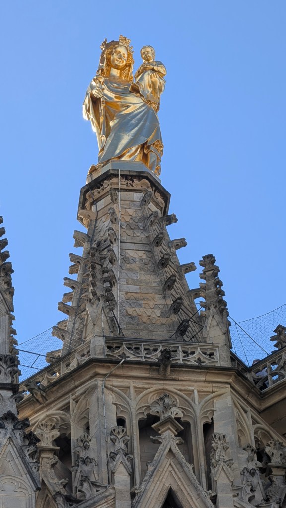 A gilded statue of the Virgin Mary, Notre-Dame de Aquitaine, sits atop the tower since the 1800s. She is facing the Médoc wine region.