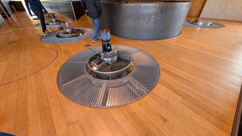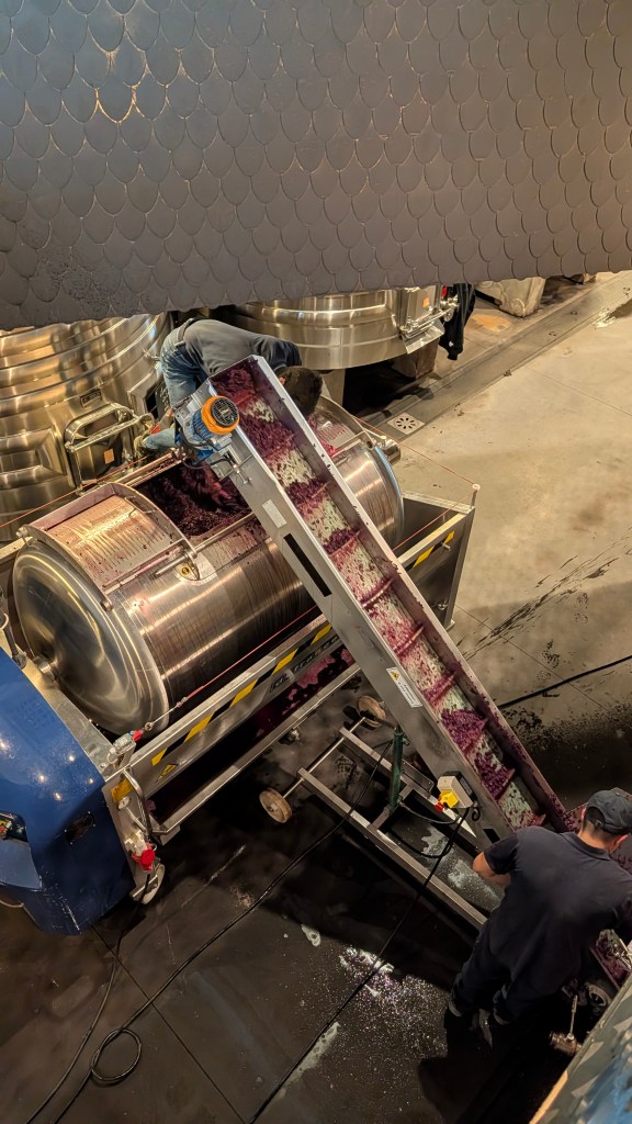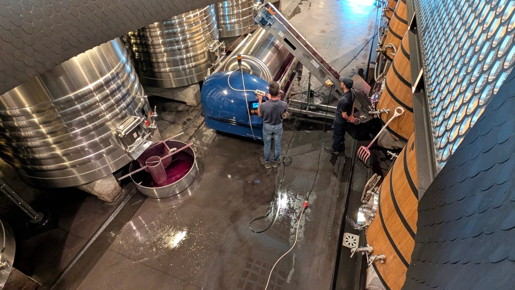 The harvest having been recent, the maceration is about done, and they have moved on to mixing and removing solids.