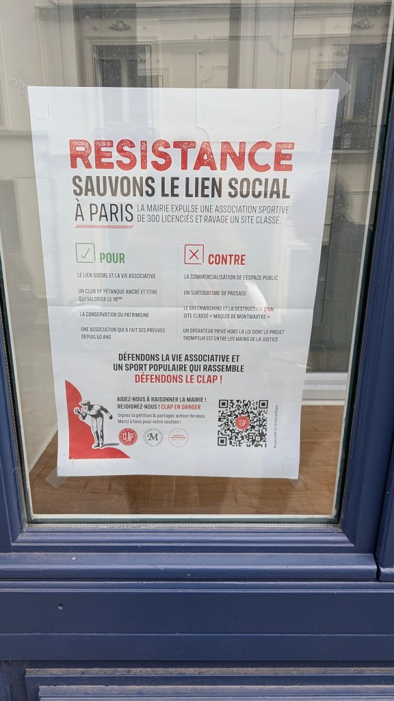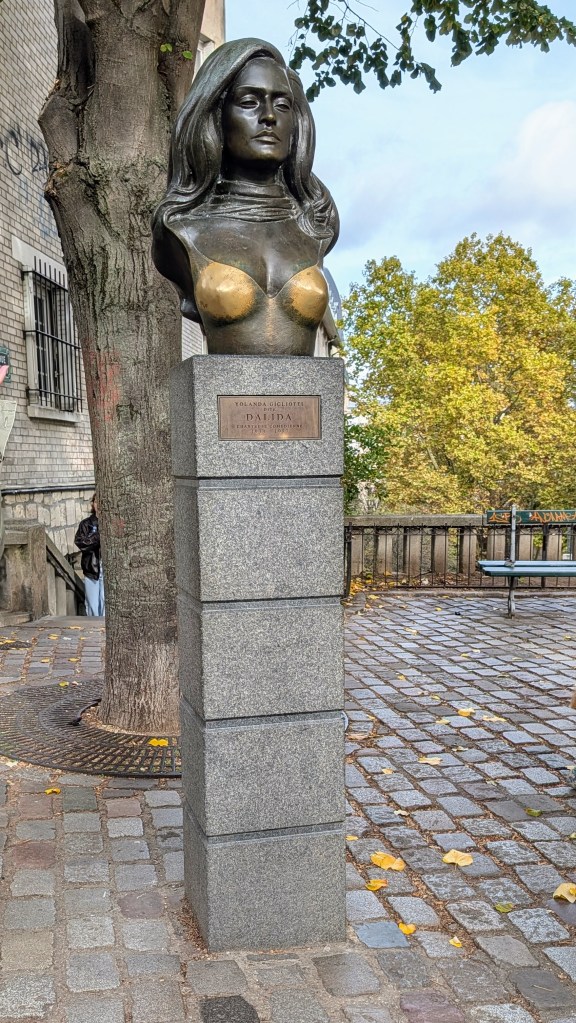 A statue of Dalida was erected in a square dedicated to her 10 years after her death. Her breasts are wiped to shiny because it is believed to touch her breasts brings one good luck, although this makes no sense to me after she buried so many partners. Bocce is played in the square. It is a very popular activity in Paris due to its sociability; it can be a glue to a community.