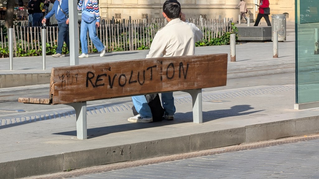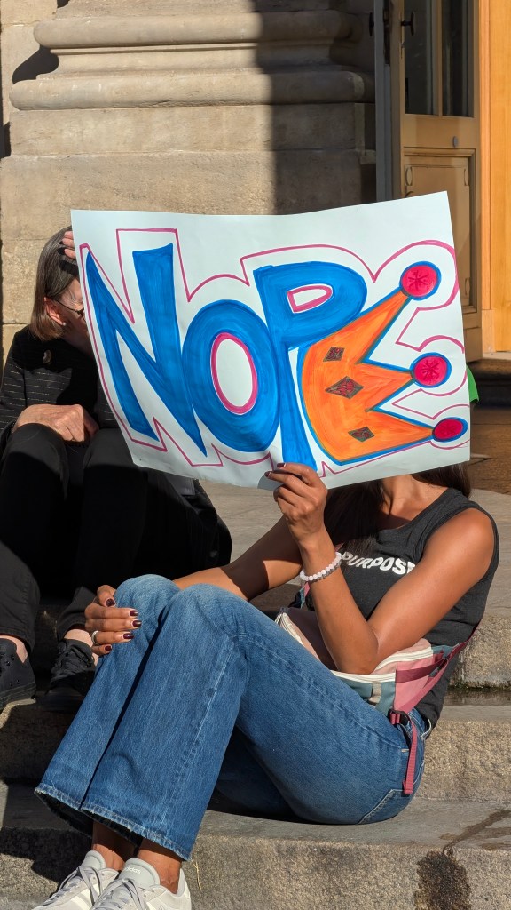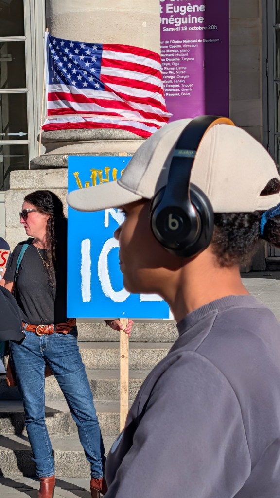 Once we returned to Place de la Comédie, we realized that it was a “No Kings” protest day in the U.S., and several expats were displaying signs in front of the opera house.
