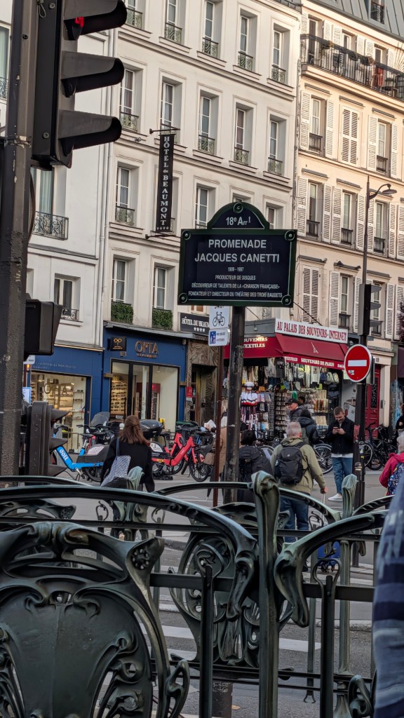 We had a walking tour booked for the morning. We left our luggage at the hotel and headed to the assigned metro stop at the foot of the hill. We noted that the metro sign does indeed look the same as the one we had seen this summer in Montreal, said to have been gifted from Paris.